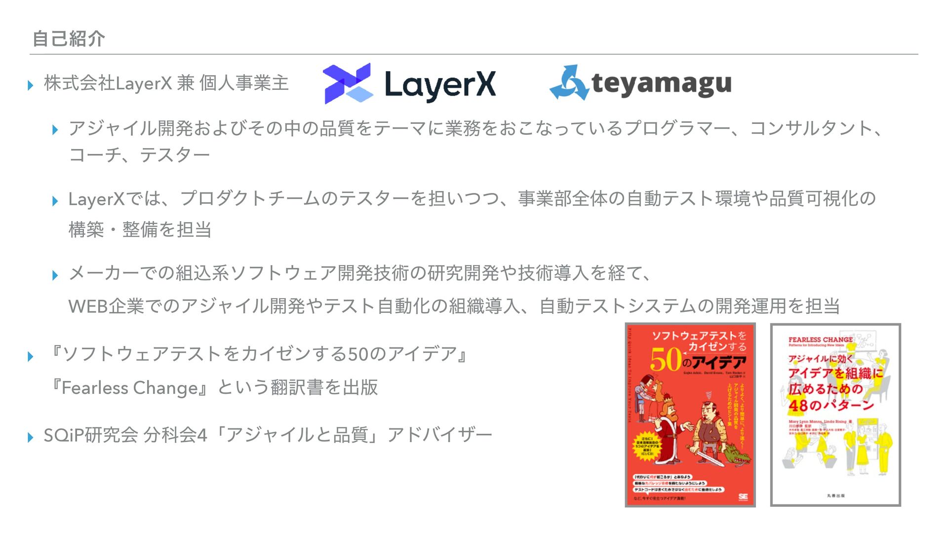 1. ࣗݾ঺հ ▸ גࣜձࣾLayerX ݉ ݸਓࣄۀओ ▸ ΞδϟΠϧ։ൃ͓Αͼͦͷதͷ඼࣭ΛςʔϚʹۀ຿Λ͓͜ͳ͍ͬͯΔϓϩάϥϚʔɺίϯαϧλϯτɺ ίʔνɺςελʔ ▸ LayerXͰ͸ɺϓϩμΫτνʔϜͷςελʔΛ୲͍ͭͭɺࣄۀ෦શମͷࣗಈςετ؀ڥ΍඼࣭ՄࢹԽͷ