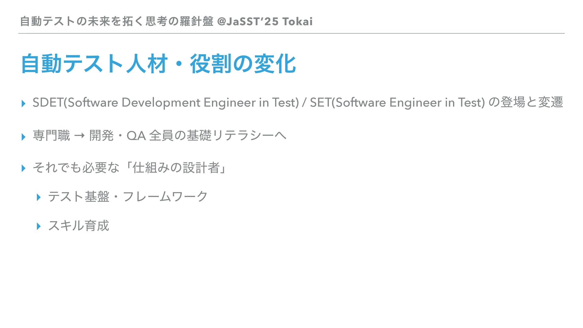 10. ࣗಈςετͷະདྷΛ୓͘ࢥߟͷཏ਑൫ @JaSST’25 Tokai ࣗಈςετਓࡐɾ໾ׂͷมԽ ▸ SDET(Software Development Engineer in Test)