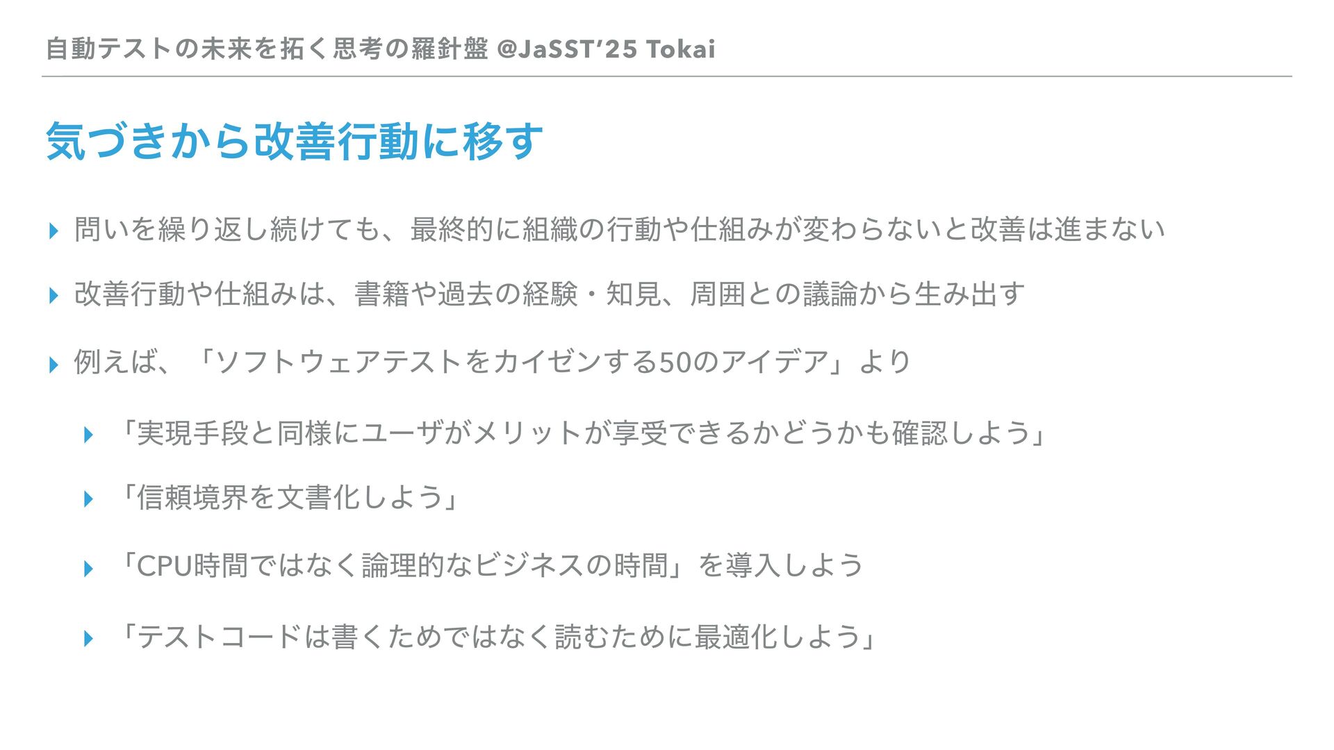 12. ࣗಈςετͷະདྷΛ୓͘ࢥߟͷཏ਑൫ @JaSST’25 Tokai ؾ͖͔ͮΒվળߦಈʹҠ͢ ▸ ໰͍Λ܁Γฦ͠ଓ͚ͯ΋ɺ࠷ऴతʹ૊৫ͷߦಈ΍࢓૊Έ͕มΘΒͳ͍ͱվળ͸ਐ·ͳ͍ ▸ վળߦಈ΍࢓૊Έ͸ɺॻ੶΍աڈͷܦݧɾ஌ݟɺपғͱͷٞ࿦͔ΒੜΈग़͢ ▸ ྫ͑͹ɺʮιϑτ΢ΣΞςετΛΧΠθϯ͢Δ50ͷΞΠσΞʯΑΓ
