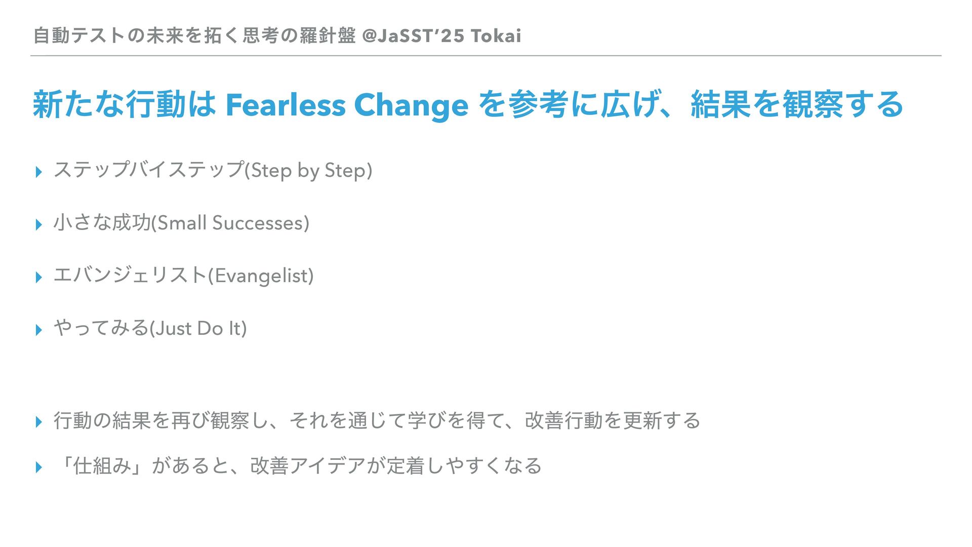 13. ࣗಈςετͷະདྷΛ୓͘ࢥߟͷཏ਑൫ @JaSST’25 Tokai ৽ͨͳߦಈ͸ Fearless Change Λࢀߟʹ޿͛ɺ݁ՌΛ؍࡯͢Δ ▸ εςοϓόΠεςοϓ(Step by