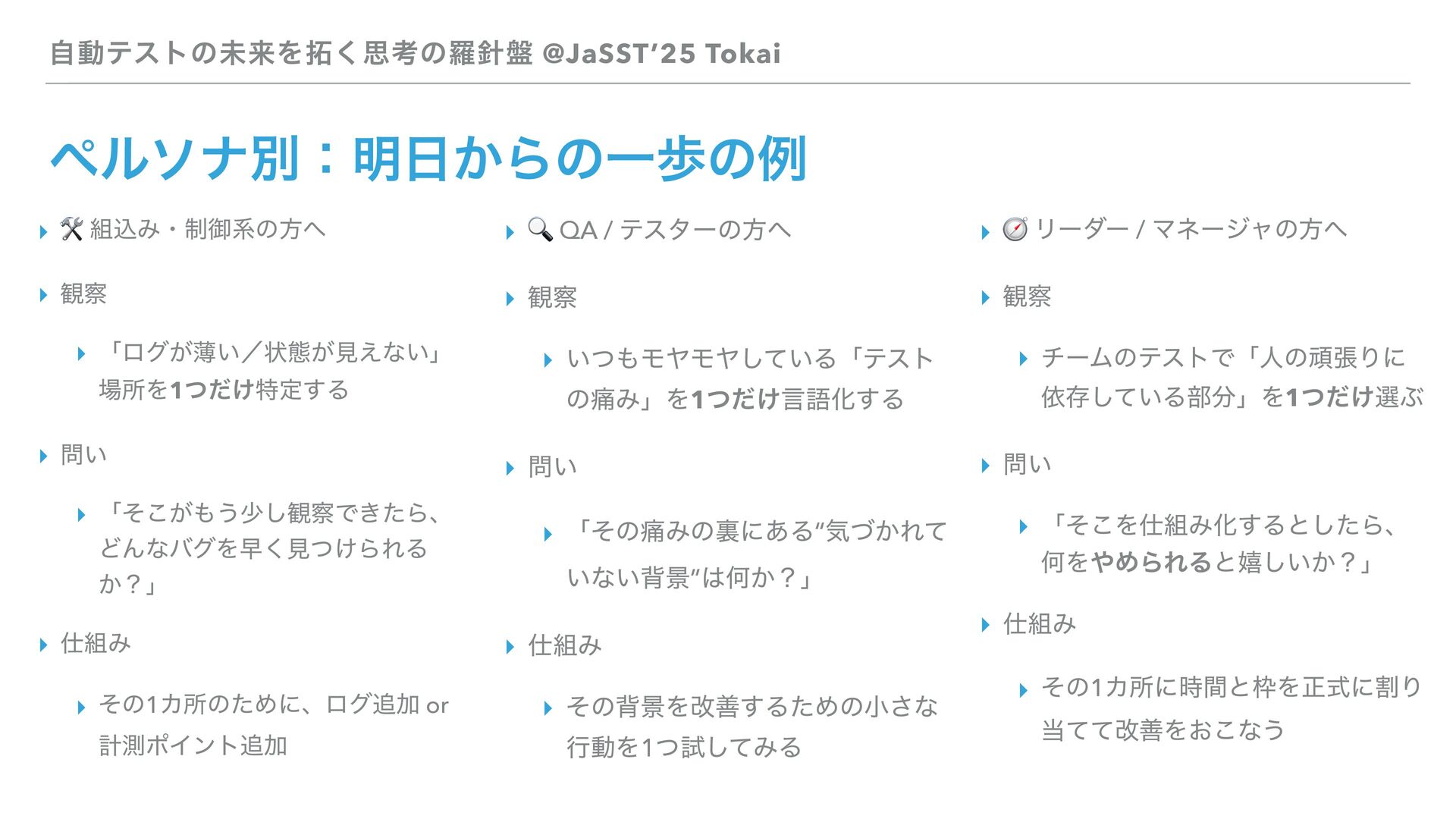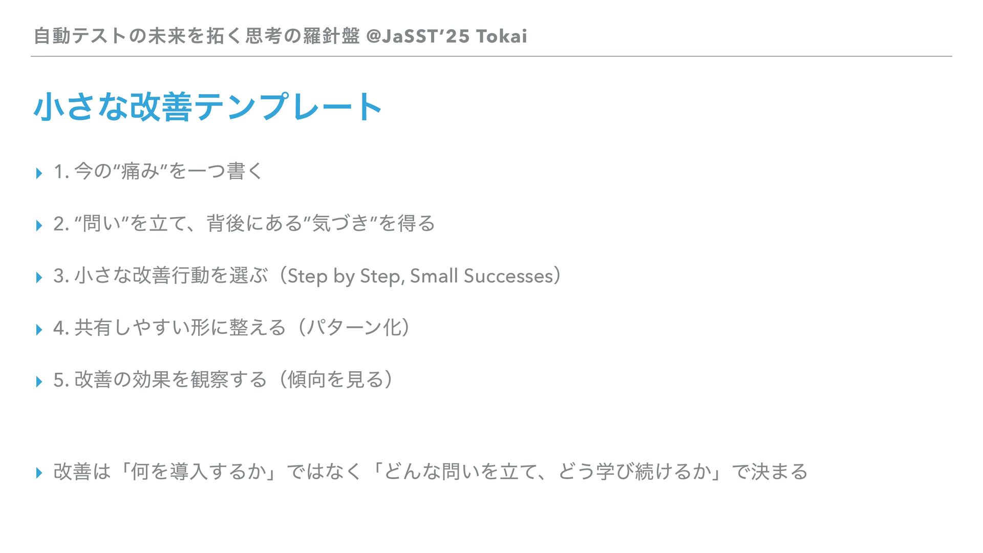 15. ࣗಈςετͷະདྷΛ୓͘ࢥߟͷཏ਑൫ @JaSST’25 Tokai খ͞ͳվળςϯϓϨʔτ ▸ 1. ࠓͷ“௧Έ”ΛҰͭॻ͘ ▸ 2. “໰͍”Λཱͯɺഎޙʹ͋Δ”ؾ͖ͮ”ΛಘΔ
