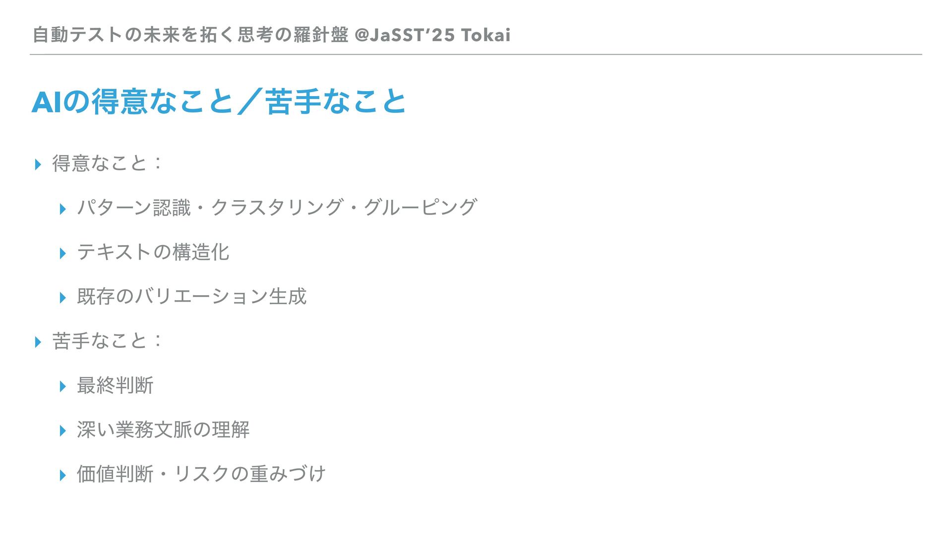 16. ࣗಈςετͷະདྷΛ୓͘ࢥߟͷཏ਑൫ @JaSST’25 Tokai AIͷಘҙͳ͜ͱʗۤखͳ͜ͱ ▸ ಘҙͳ͜ͱɿ ▸ ύλʔϯೝࣝɾΫϥελϦϯάɾάϧʔϐϯά ▸ ςΩετͷߏ଄Խ
