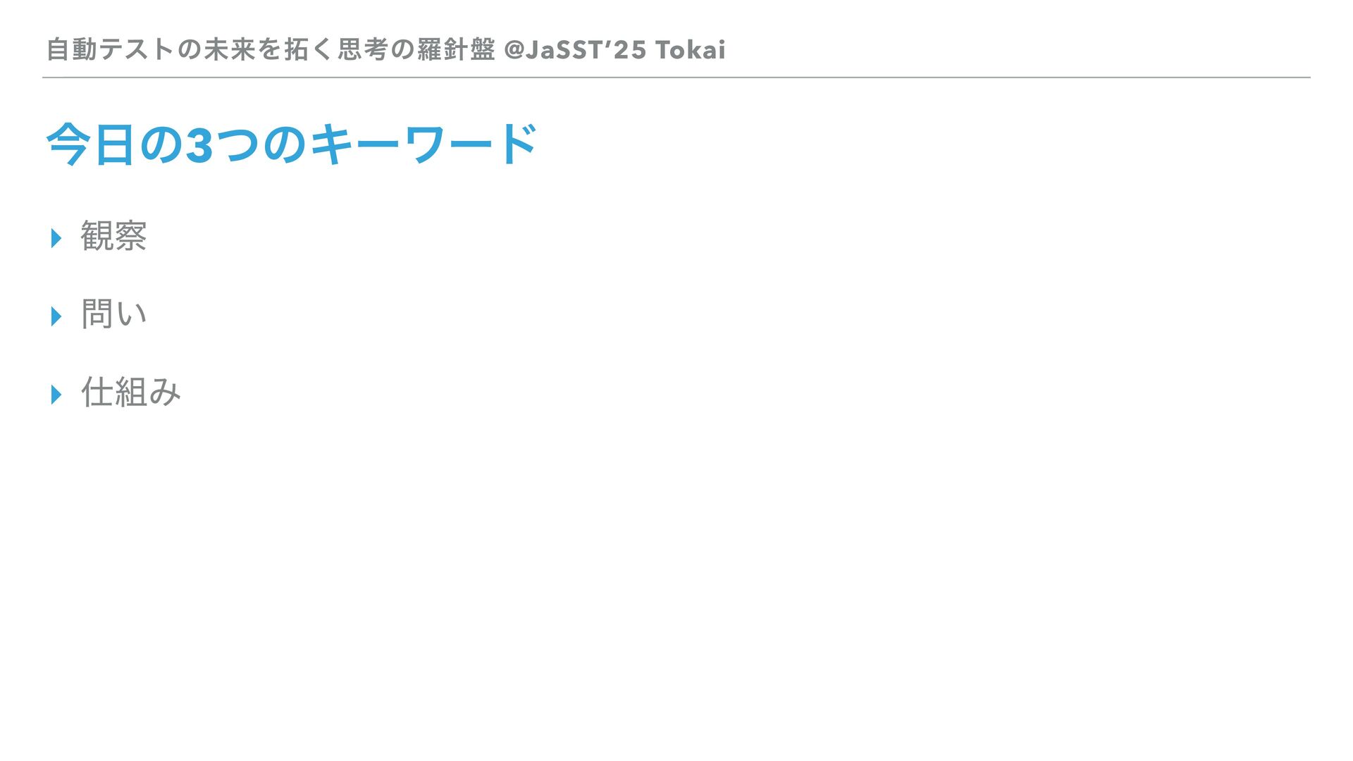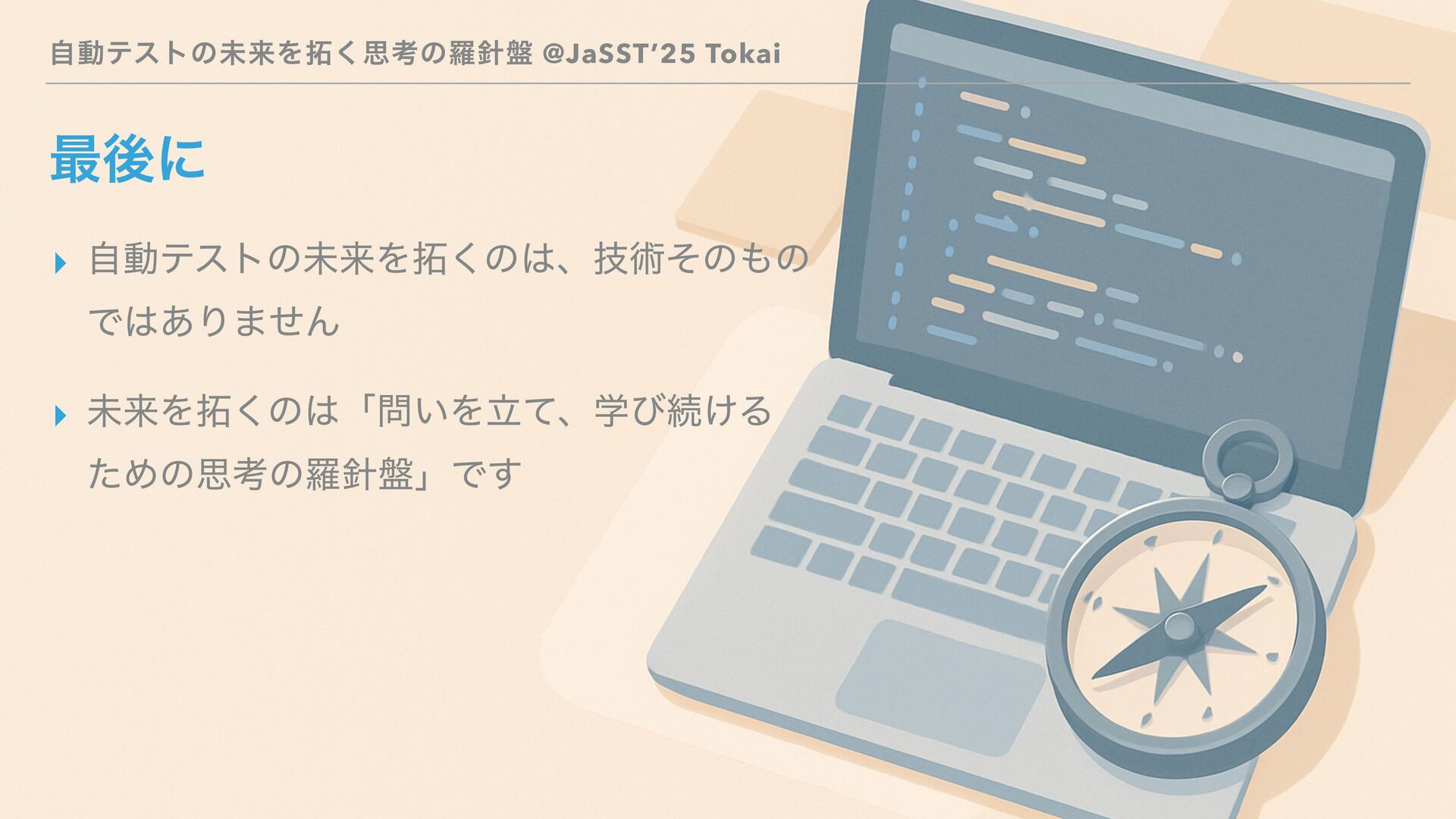 Material of the keynote speech at JaSST'25 Tokai( #jassttokai25 , #jassttokai ) on the theme of "自動テストの未来を拓く思考の羅針盤(A Compass of Thought: Guiding the Future of Test Automation)".