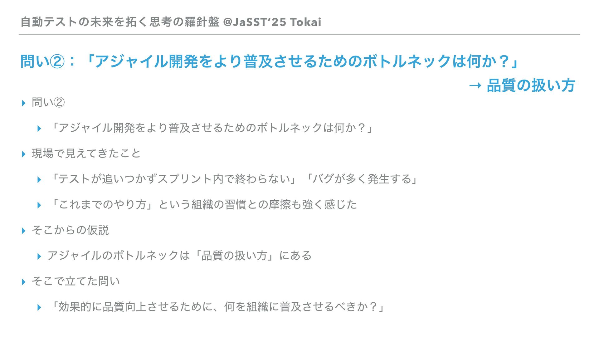 5. ࣗಈςετͷະདྷΛ୓͘ࢥߟͷཏ਑൫ @JaSST’25 Tokai ໰͍ᶄɿʮΞδϟΠϧ։ൃΛΑΓීٴͤ͞ΔͨΊͷϘτϧωοΫ͸Կ͔ʁʯ ɹɹɹɹɹɹɹɹɹɹɹɹɹɹɹɹɹɹɹɹɹɹɹɹɹɹɹɹɹɹ→ ඼࣭ͷѻ͍ํ ▸ ໰͍ᶄ ▸ ʮΞδϟΠϧ։ൃΛΑΓීٴͤ͞ΔͨΊͷϘτϧωοΫ͸Կ͔ʁʯ