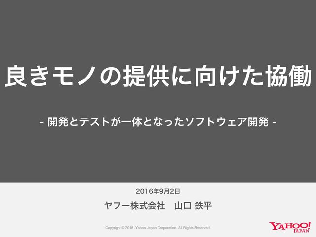 世の中やヤフー内でおこなっている、開発とテストが一体となったソフトウェア開発を紹介しつつ、そのような状態に移行していった際の課題や克服した方法を紹介しました。