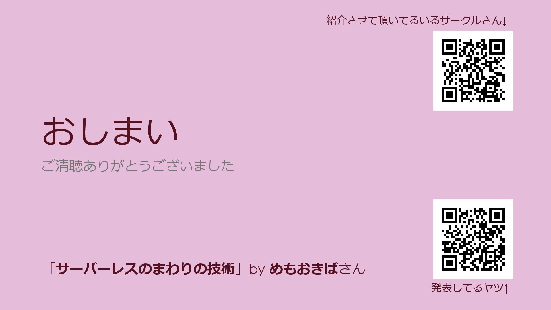 おしまい ご清聴ありがとうございました 発表してるヤツ↑ 紹介させて頂いてるいるサークルさん↓ 「サーバーレスのまわりの技術」by めもおきばさん