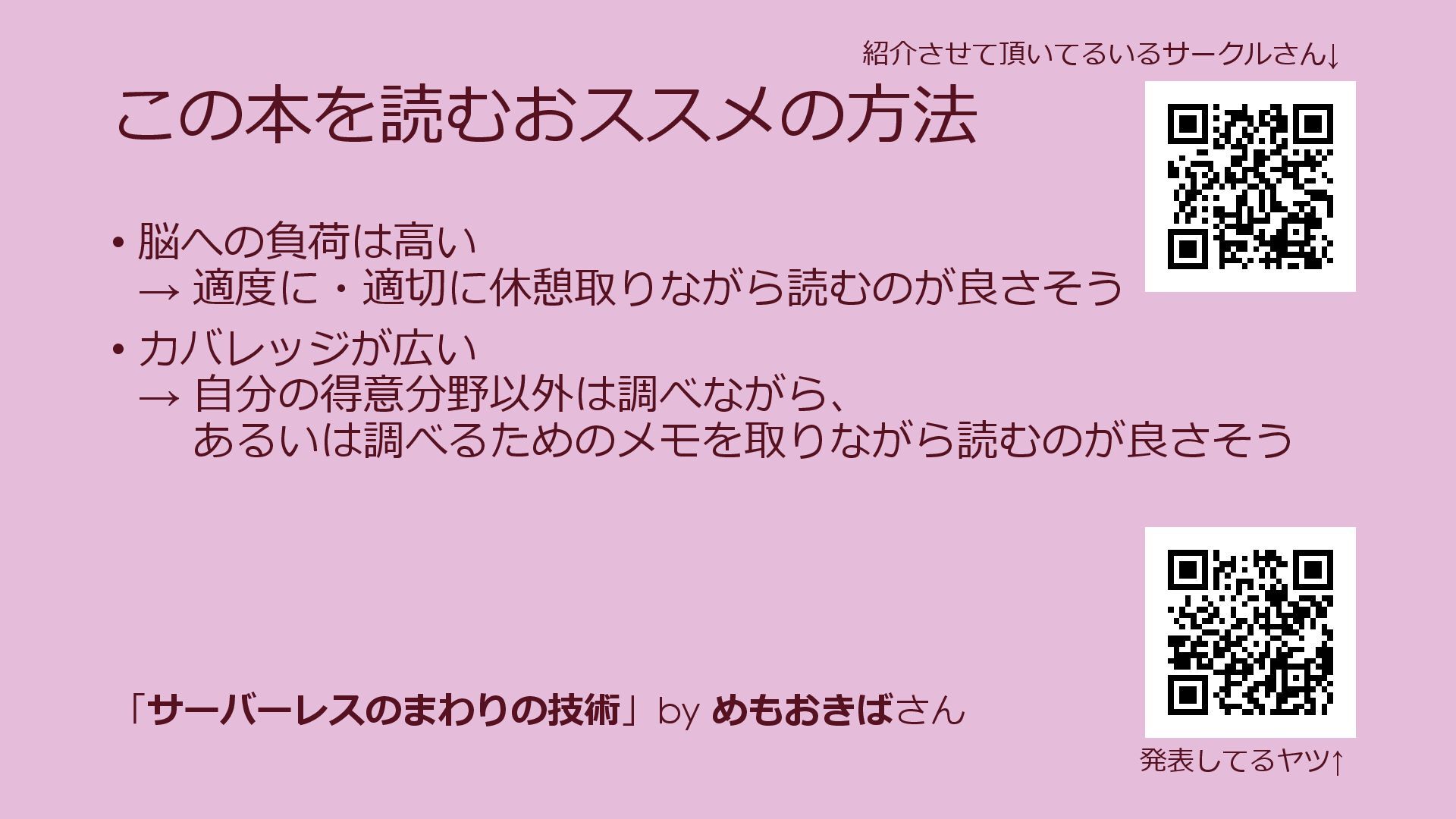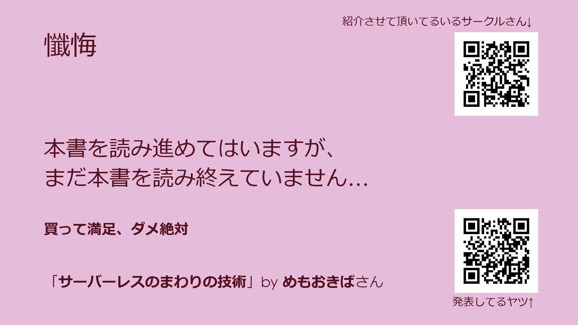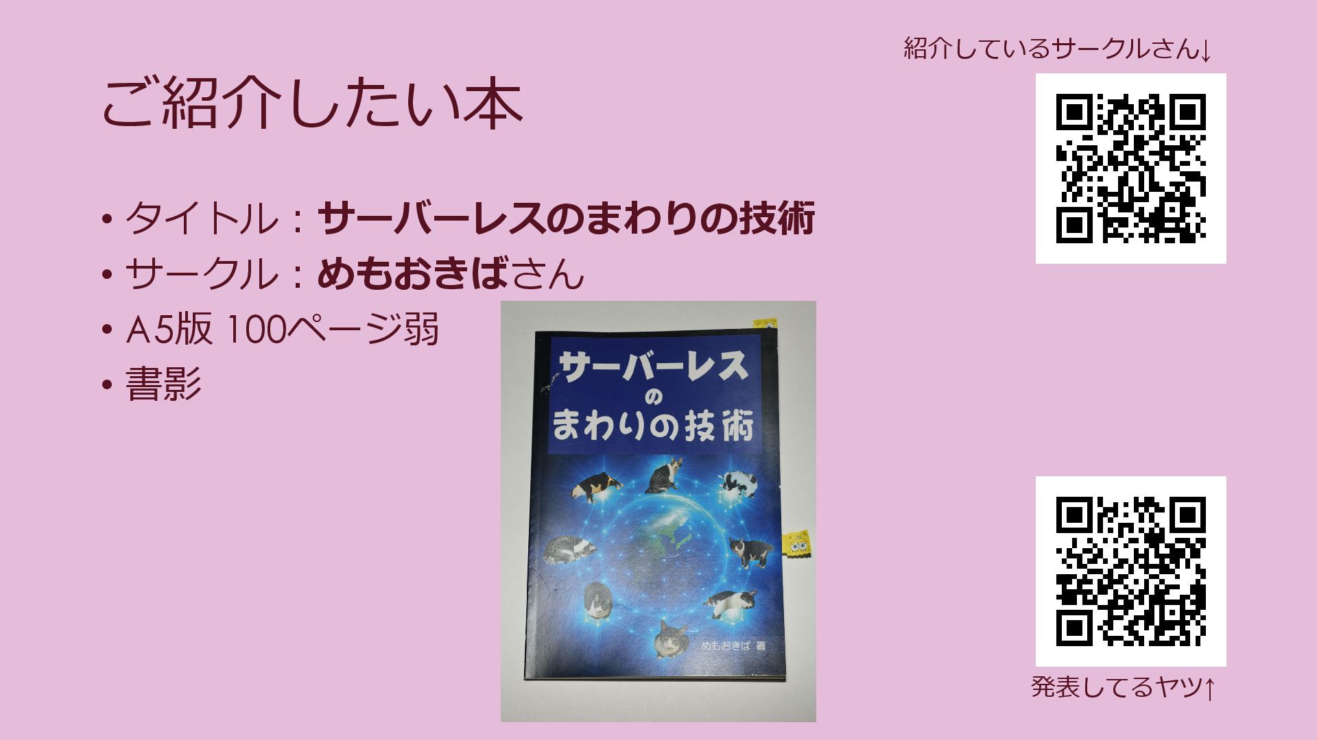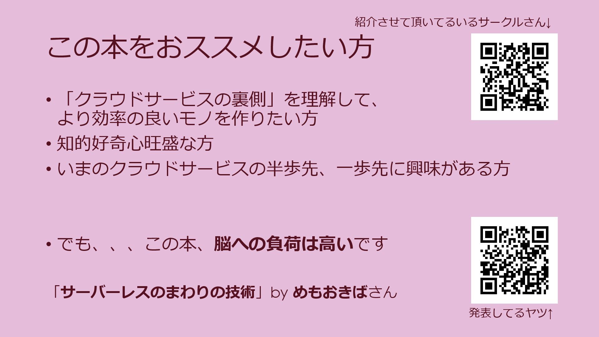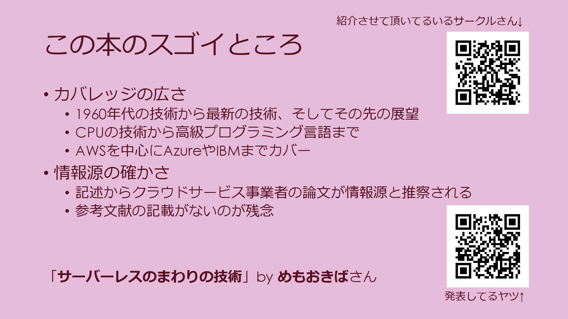 発表してるヤツ↑ 紹介させて頂いてるいるサークルさん↓ 「サーバーレスのまわりの技術」by めもおきばさん