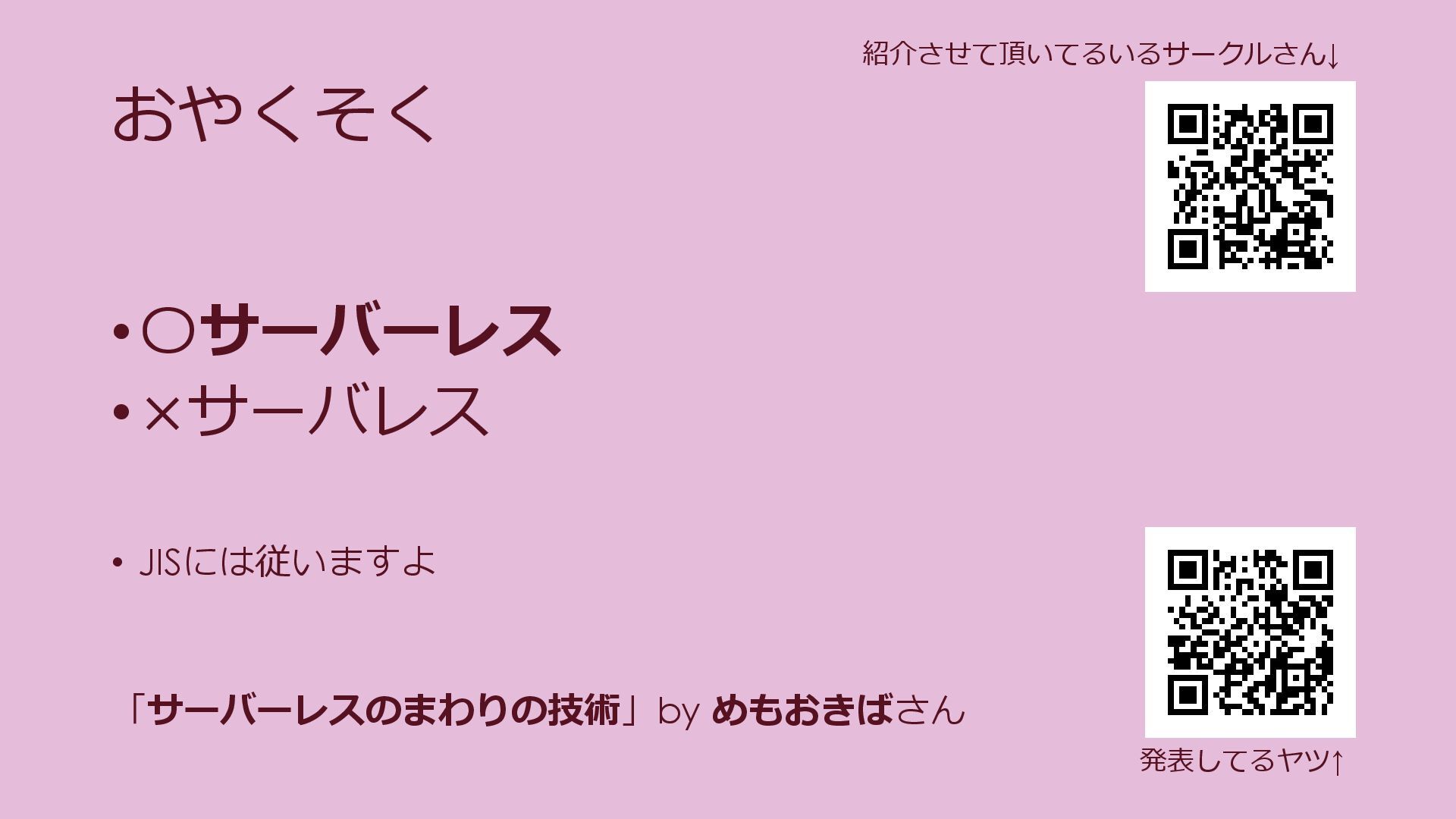 おやくそく •〇サーバーレス •×サーバレス • JISには従いますよ 発表してるヤツ↑ 紹介させて頂いてるいるサークルさん↓ 「サーバーレスのまわりの技術」by めもおきばさん