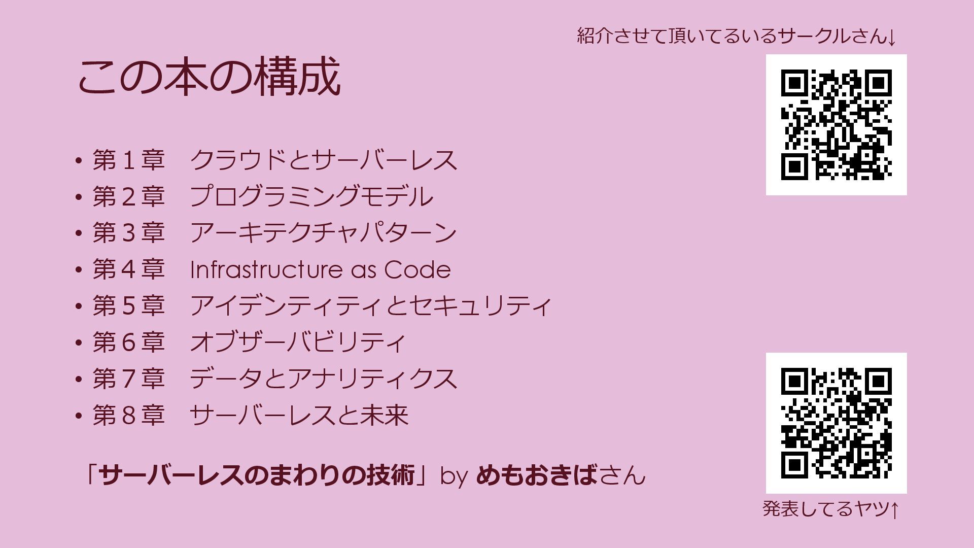 • 第4章 Infrastructure as Code • 第5章 アイデンティティとセキュリティ • 第6章 オブザーバビリティ • 第7章 データとアナリティクス • 第8章 サーバーレスと未来 発表してるヤツ↑ 紹介させて頂いてるいるサークルさん↓ 「サーバーレスのまわりの技術」by めもおきばさん