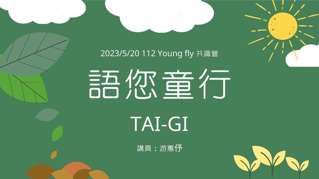 112年Young飛全球行動計畫-共識營簡報 簡報下載連結:https://reurl.cc/EGqNQn 地點:救國團劍潭青年活動中心 1樓集賢廳 (台北市士林區中山北路四段16號) 時間:9:00-16:00 授權方式:CC BY 4.0