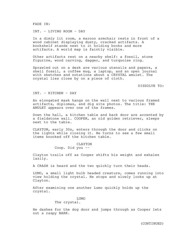 dimly lit room, a maroon armchair rests in front of a wood cabinet displaying dusty, cracked artifacts. A bookshelf stands next to it holding books and more artifacts. A world map is faintly visible. Other artifacts rest on a nearby shelf: a fossil, stone figurine, wood carving, dagger, and turquoise ring. Sprawled out on a desk are various utensils and papers, a shell fossil, a coffee mug, a laptop, and an open journal with sketches and notations about a CRYSTAL amulet. The crystal lies close by on a piece of cloth. DISSOLVE TO: INT. - KITCHEN - DAY An elongated mask hangs on the wall next to various framed artifacts, diplomas, and dig site photos. The title: THE AMULET appears over one of the frames. Down the hall, a kitchen table and back door are accented by a fieldstone wall. COOPER, an old golden retriever, sleeps next to the table. CLAYTON, early 30s, enters through the door and clicks on the lights while closing it. He turns to see a few small items knocked off the kitchen table. CLAYTON Coop. Did you -- Clayton trails off as Cooper shifts his weight and exhales lazily. A CRASH is heard and the two quickly turn their heads. LUMO, a small light bulb headed creature, comes running into view holding the crystal. He stops and slowly looks up at Clayton. After examining one another Lumo quickly holds up the crystal. LUMO The crystal. He dashes for the dog door and jumps through as Cooper lets out a raspy BARK. (CONTINUED)