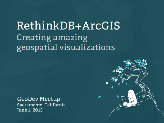 In this talk, we'll take public data to create a visualization of restaurant density across the US. We'll use use RethinkDB to clean, analyze and store our data. Then, we'll feed the data into ArcGIS in order create an interactive visualization. After this talk, you'll get a sense of why a realtime database with geospatial features is an excellent tool for anything "geo" related.