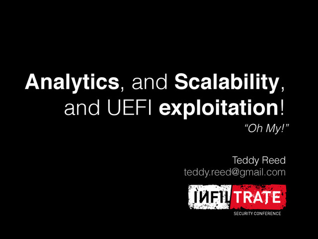 We use UEFI and commodity PC manufacturer "firmware" as a use case for vulnerability discovery and exploit development powered by analytics. BIOS, UEFI, and embedded firmware are recent focus areas for vulnerability analysis and exploit research. There are great offensive-security presentations and research on ring < 0 rootkits, failed implementations of trusted computing concepts, and hardware-assisted exploitation.