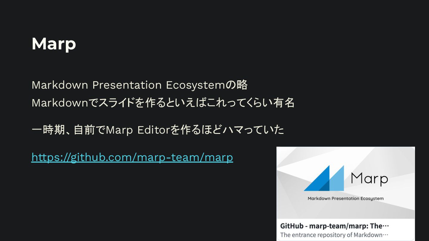 Marp Markdown Presentation Ecosystemの略 Markdownでスライドを作るといえばこれってくらい有名 一時期、自前でMarp Editorを作るほどハマっていた https://github.com/marp-team/marp