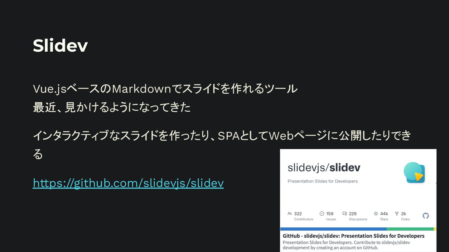 Slidev Vue.jsベースのMarkdownでスライドを作れるツール 最近、見かけるようになってきた インタラクティブなスライドを作ったり、SPAとしてWebページに公開したりでき る https://github.com/slidevjs/slidev