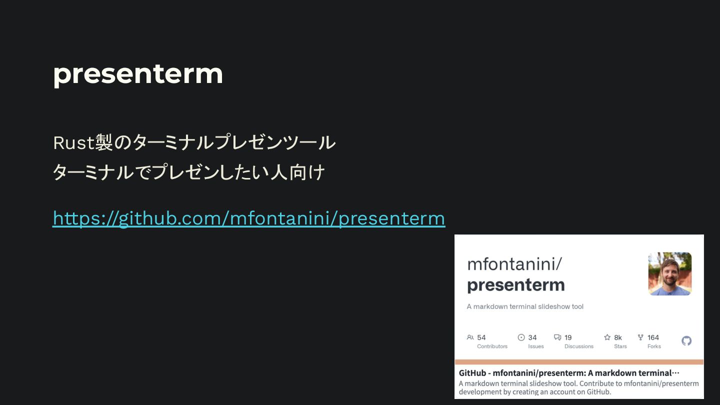 presenterm Rust製のターミナルプレゼンツール ターミナルでプレゼンしたい人向け https://github.com/mfontanini/presenterm