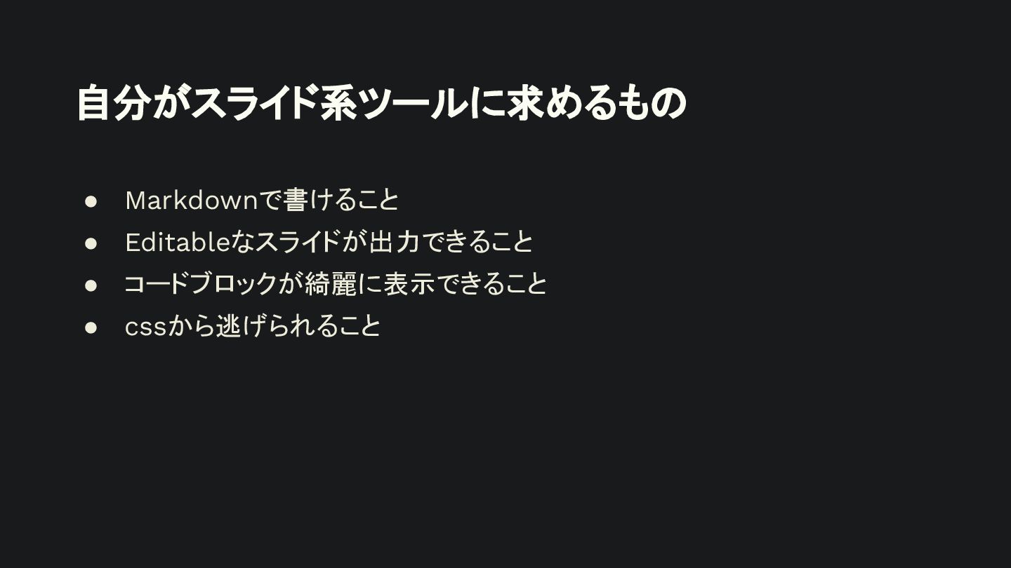 自分がスライド系ツールに求めるもの • Markdownで書けること • Editableなスライドが出力できること • コードブロックが綺麗に表示できること • cssから逃げられること