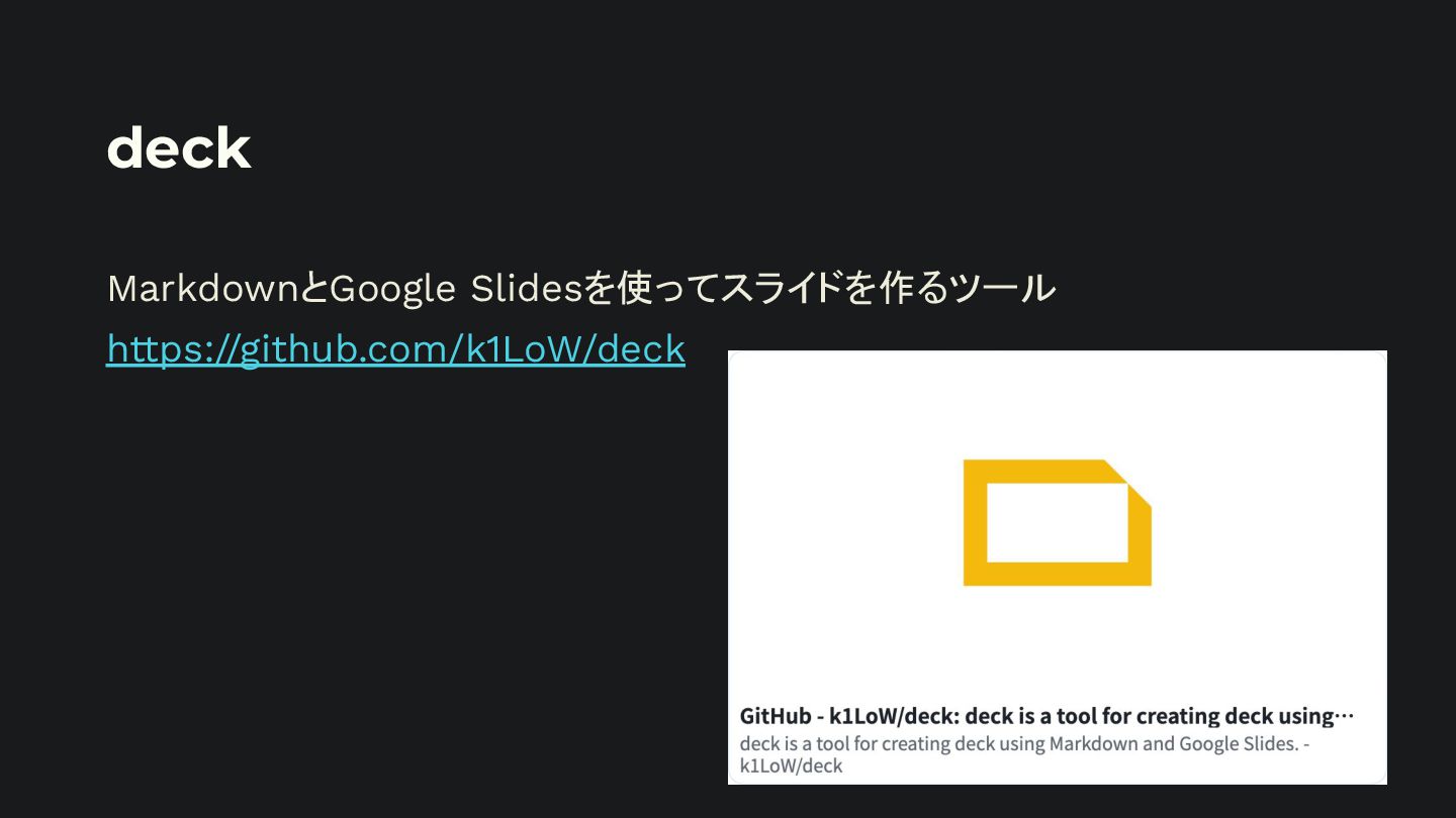 deck MarkdownとGoogle Slidesを使ってスライドを作るツール https://github.com/k1LoW/deck