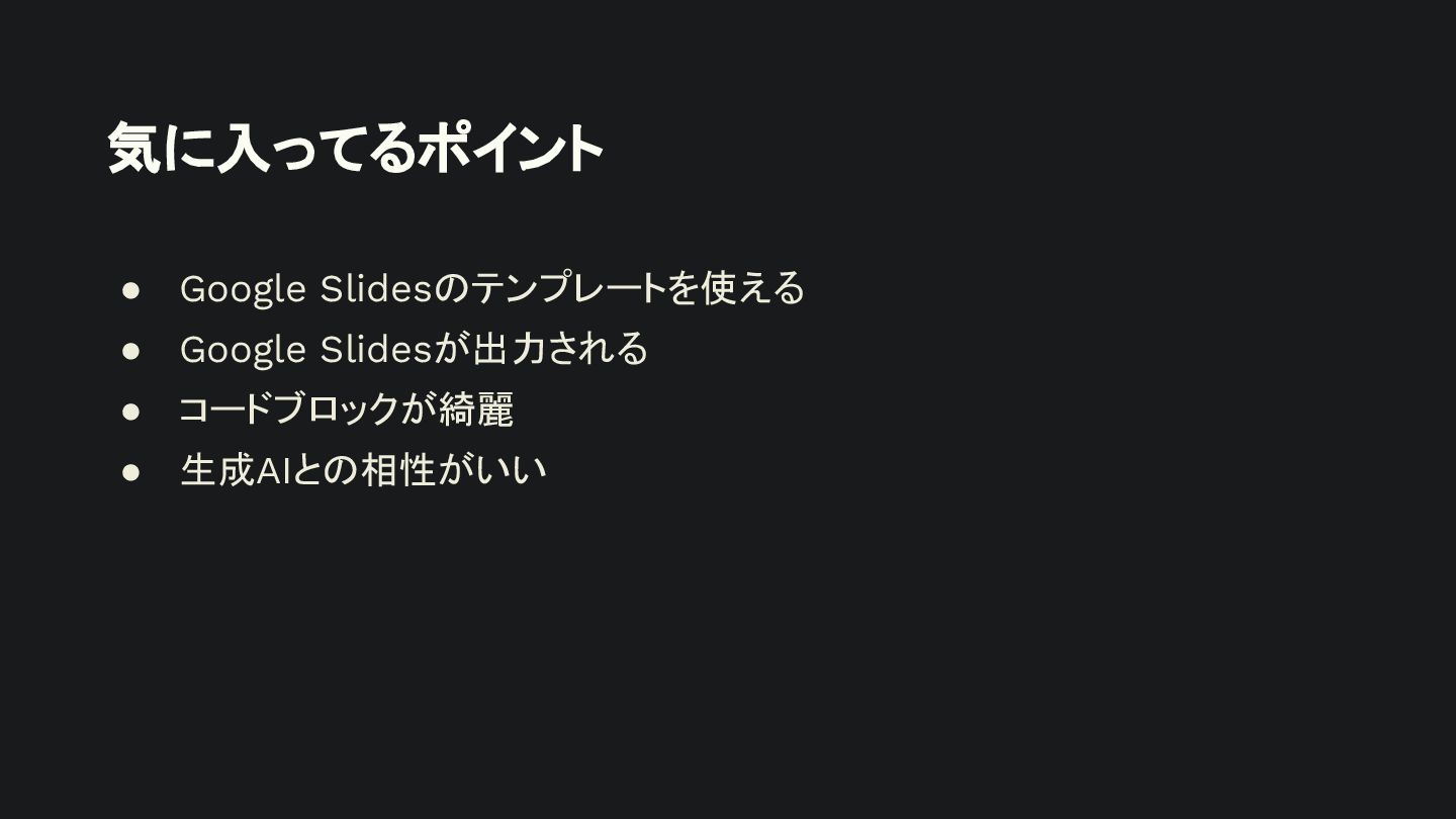 気に入ってるポイント • Google Slidesのテンプレートを使える • Google Slidesが出力される • コードブロックが綺麗 •