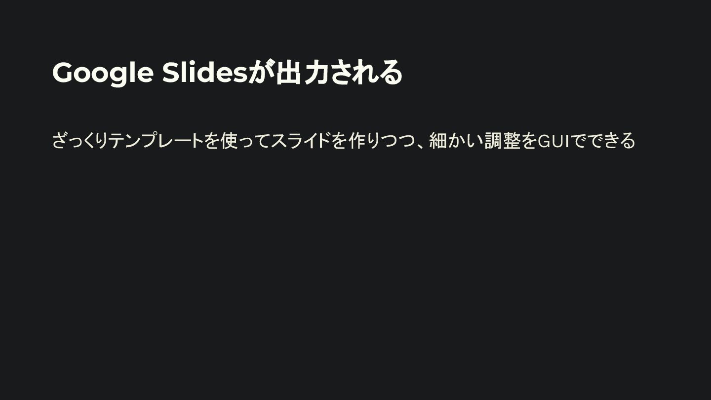 Google Slidesが出力される ざっくりテンプレートを使ってスライドを作りつつ、細かい調整をGUIでできる