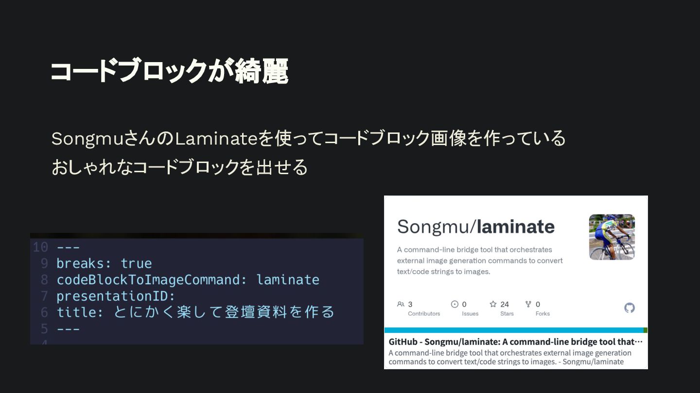 コードブロックが綺麗 SongmuさんのLaminateを使ってコードブロック画像を作っている おしゃれなコードブロックを出せる