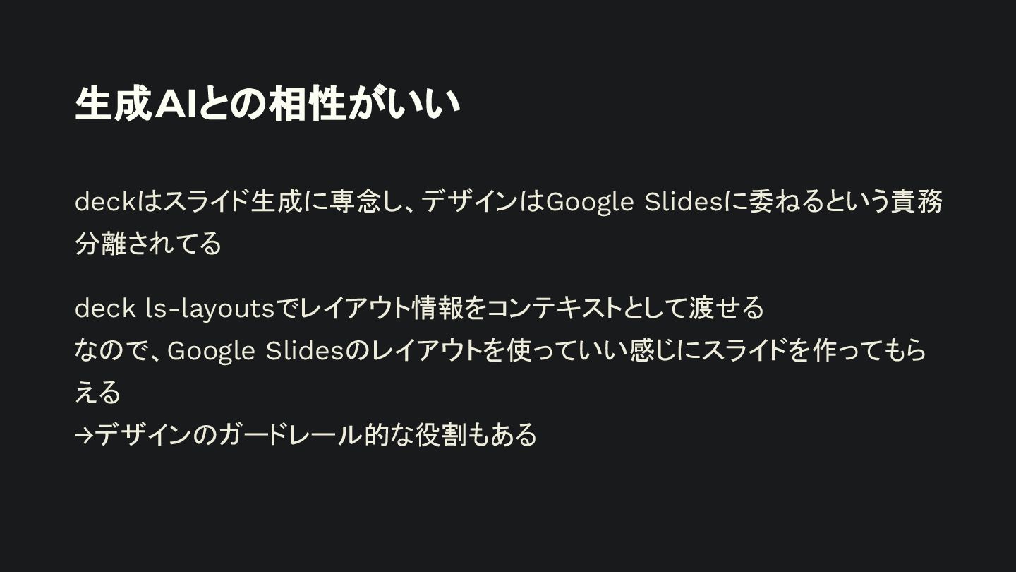 生成AIとの相性がいい deckはスライド生成に専念し、デザインはGoogle Slidesに委ねるという責務 分離されてる deck ls-layoutsでレイアウト情報をコンテキストとして渡せる なので、Google Slidesのレイアウトを使っていい感じにスライドを作ってもら える →デザインのガードレール的な役割もある