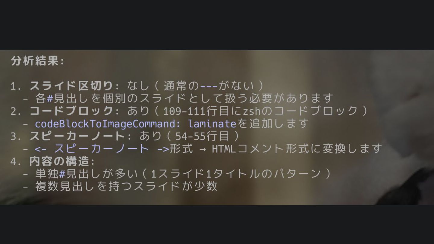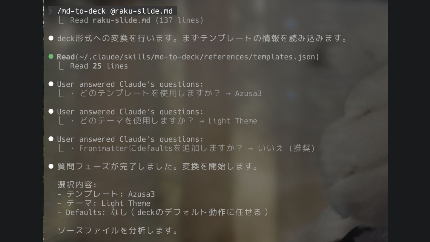 普段の使い方 1. Markdownでスライドにしたい内容を書く 2. Claude CodeのSkills使ってdeckでスライド生成 3. Google Slides側で微調整