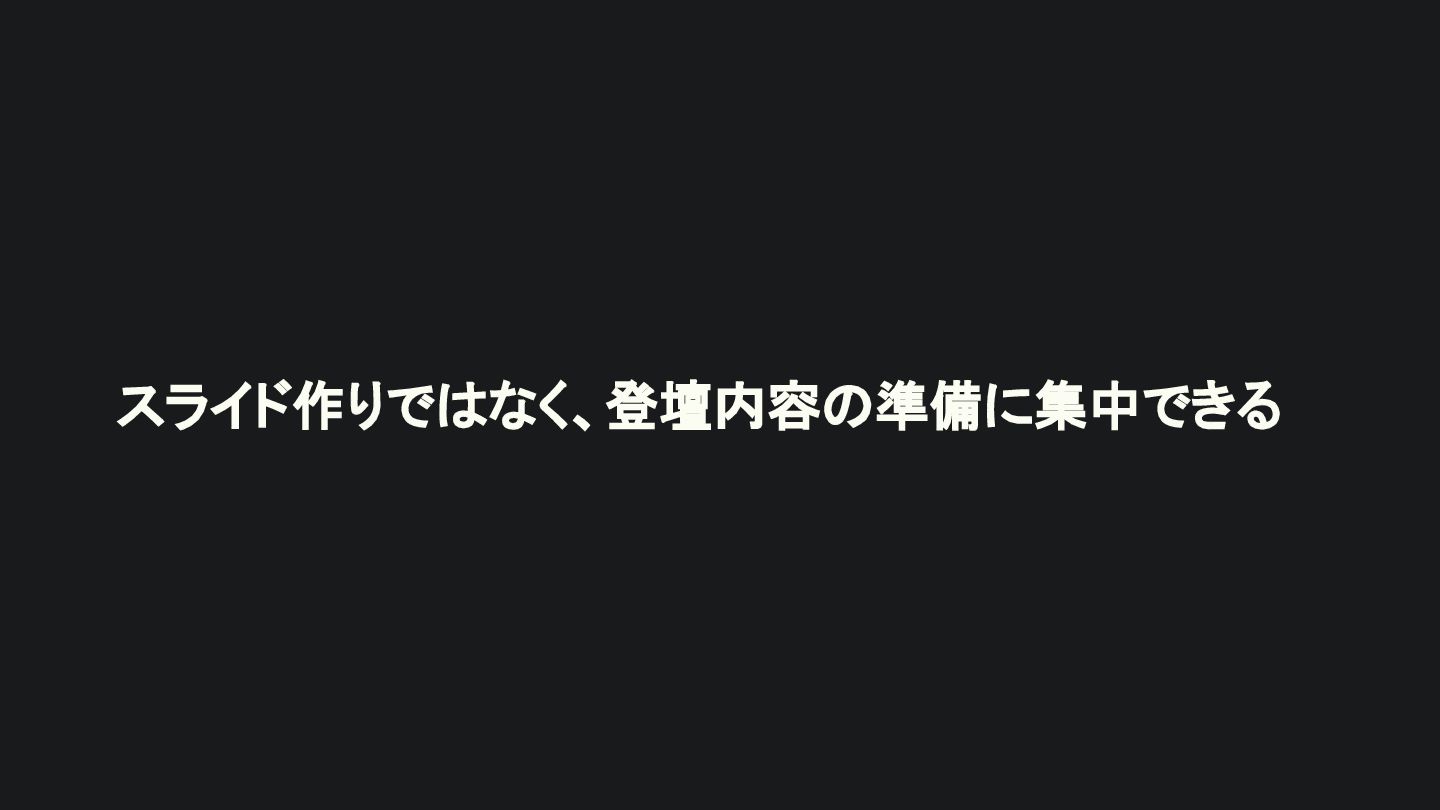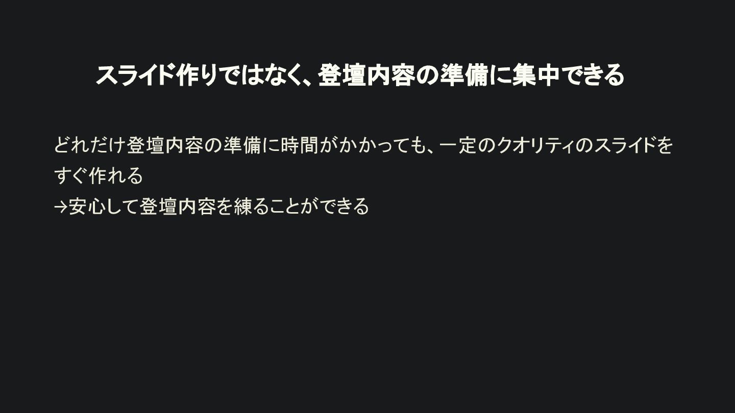 スライド作りではなく、登壇内容の準備に集中できる どれだけ登壇内容の準備に時間がかかっても、一定のクオリティのスライドを すぐ作れる →安心して登壇内容を練ることができる