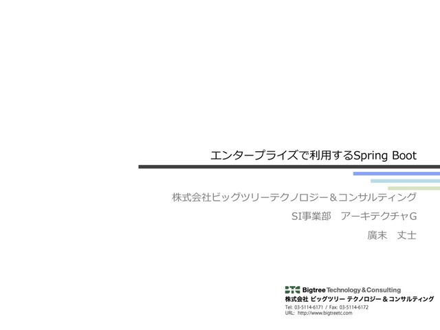 SpringBootは動くものをシンプルに作成・デプロイできる優れた仕 組みです。 しかし、開発者に実装を⼀任すると、プロダクトコードが望むものに なっている可能性は低いです。 ここでは、弊社の直近のSpringBoot開発プロジェクトのソースコー ドを参考に、開発実装基盤として設計・実装しておくべき点について、 実際のソースコードを交えてご説明します。 1 はじめに