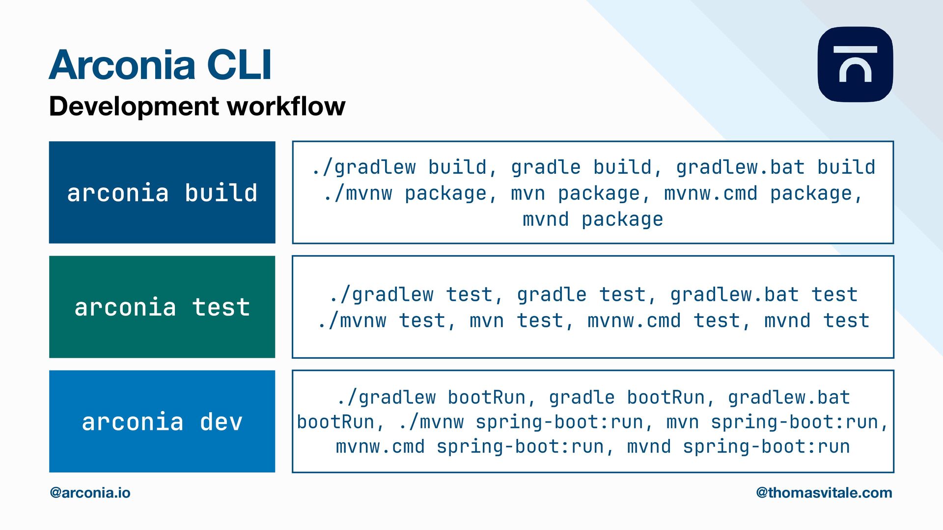 gradle build, gradlew.bat build ./mvnw package, mvn package, mvnw.cmd package, mvnd package arconia dev ./gradlew bootRun, gradle bootRun, gradlew.bat bootRun, ./mvnw spring-boot:run, mvn spring-boot:run, mvnw.cmd spring-boot:run, mvnd spring-boot:run arconia test ./gradlew test, gradle test, gradlew.bat test ./mvnw test, mvn test, mvnw.cmd test, mvnd test @thomasvitale.com @arconia.io