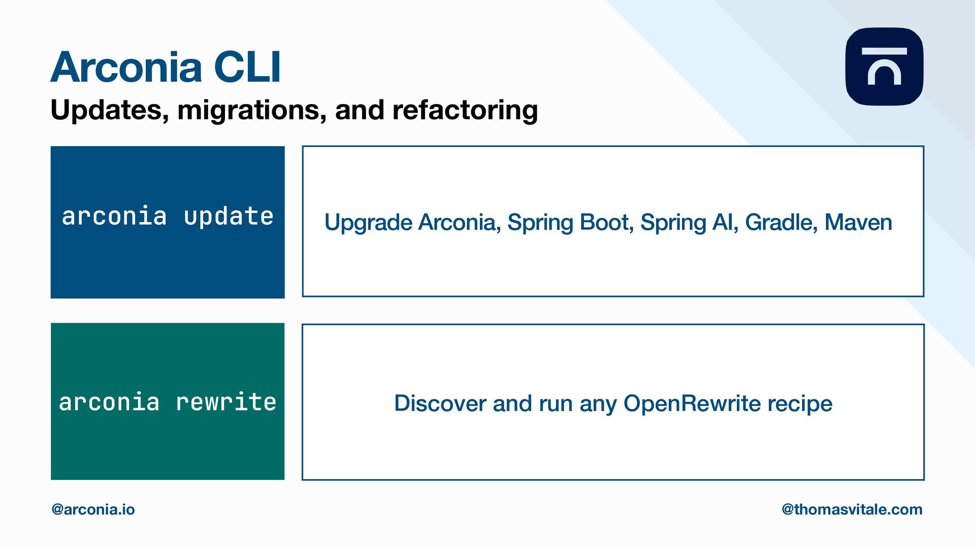 Spring Boot, Spring AI, Gradle, Maven arconia rewrite Discover and run any OpenRewrite recipe @thomasvitale.com @arconia.io