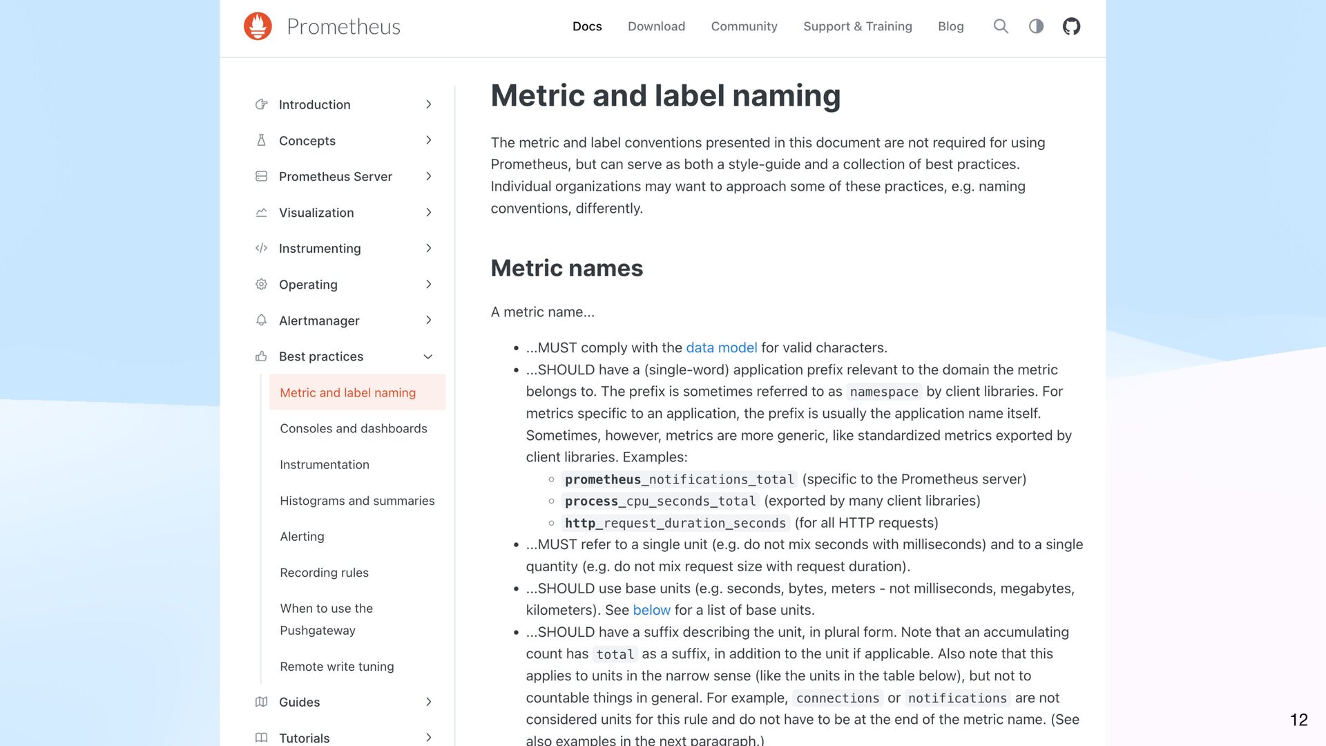 (SHOULD) 以 _total 結尾。 • process_cpu_total_seconds ❌ • process_cpu_seconds_total ✅ • Counter 單位以複數形式。 • http_request_total ❌ • http_requests_total ✅ 13