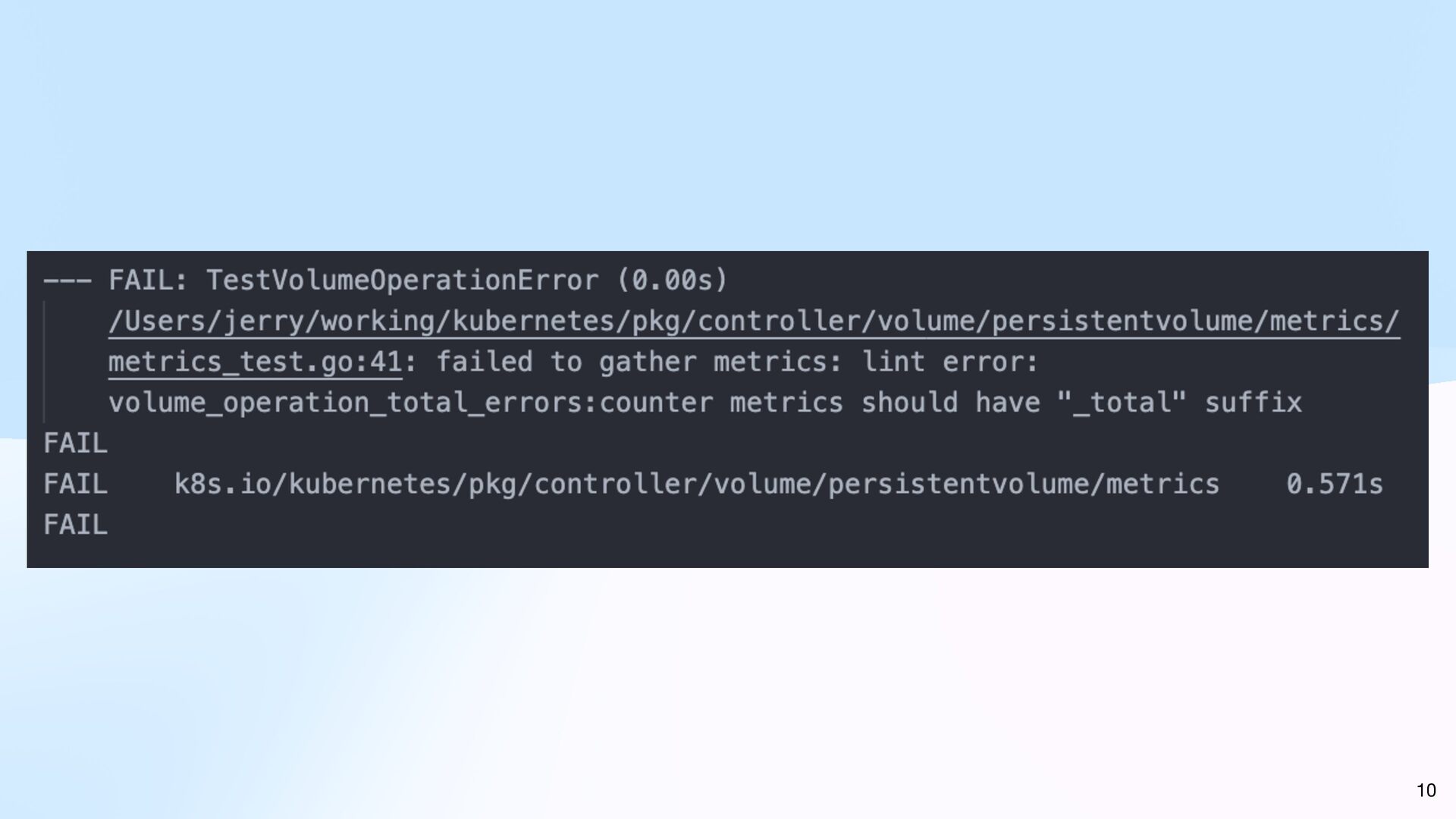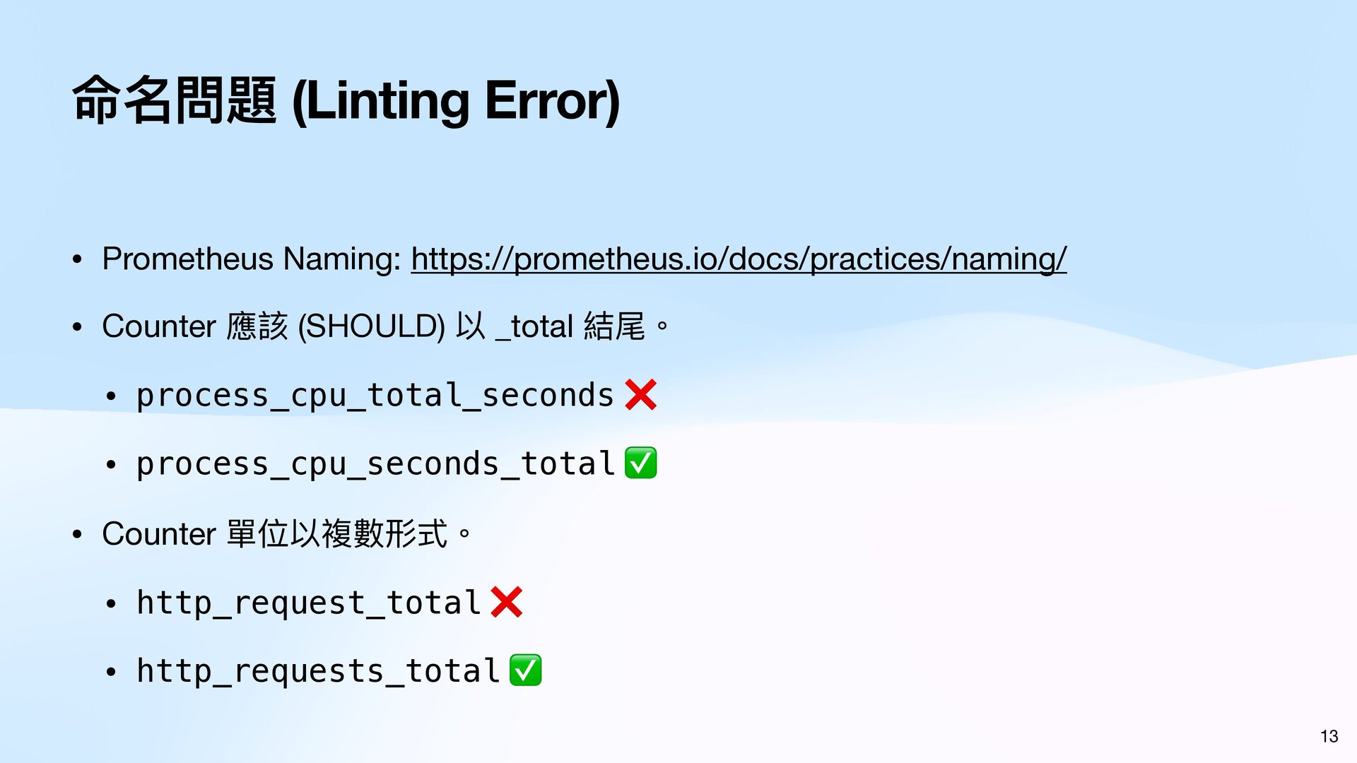 命名問題 (Linting Error) • Prometheus Naming: https://prometheus.io/docs/practices/naming/ • Counter 應該