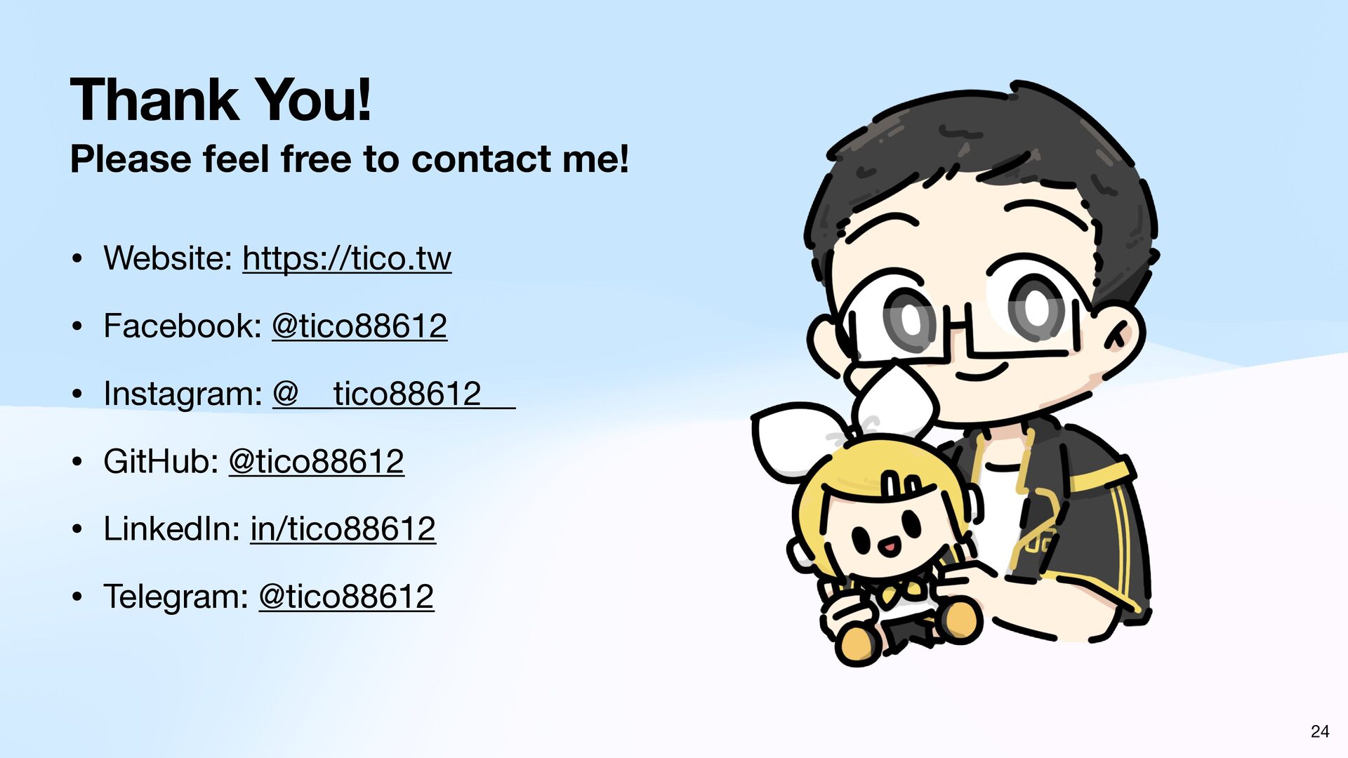 • GitHub: @tico88612 • LinkedIn: in/tico88612 • Telegram: @tico88612 Thank You! Please feel free to contact me!