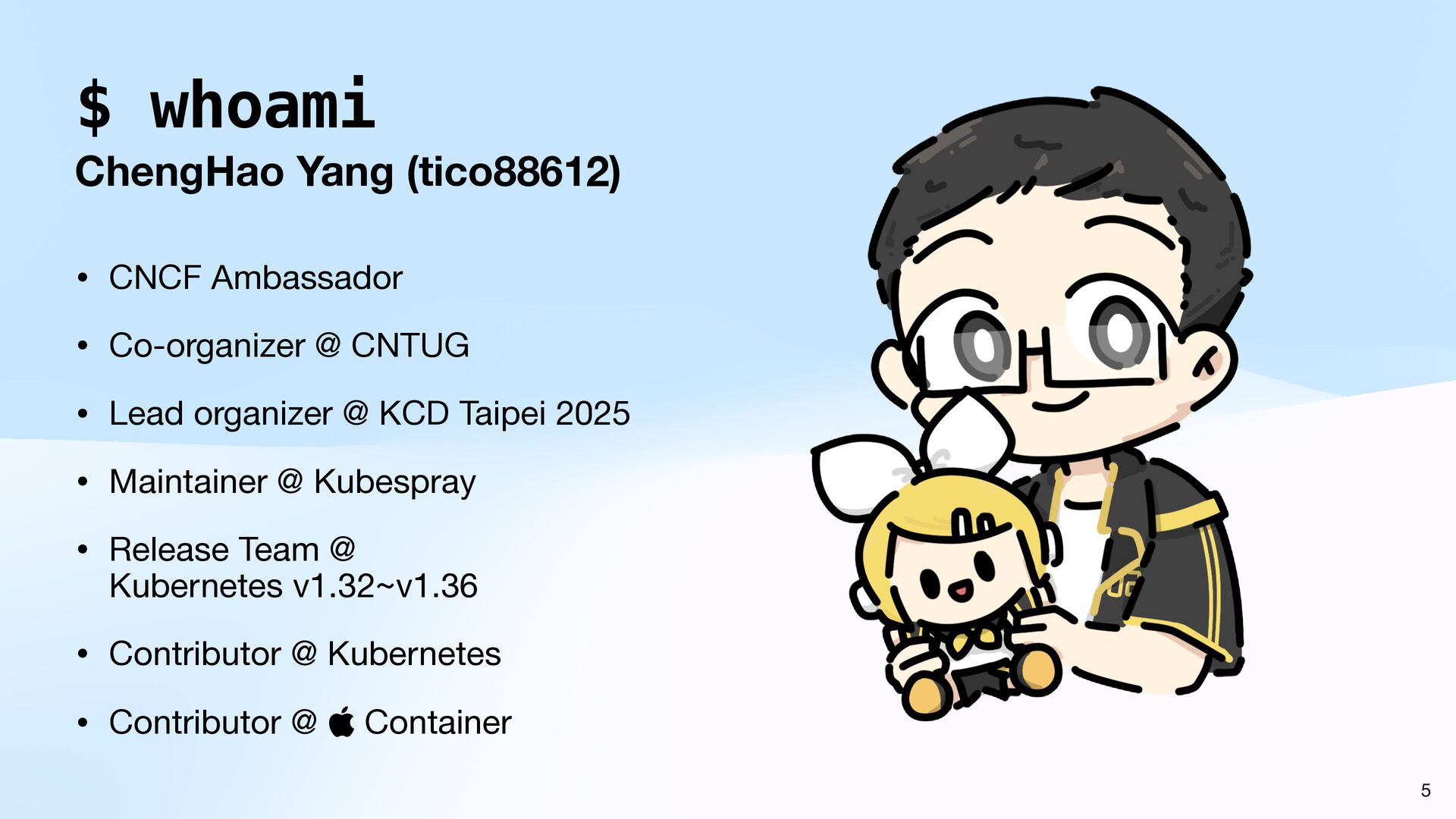 organizer @ KCD Taipei 2025 • Maintainer @ Kubespray • Release Team @ Kubernetes v1.32~v1.36 • Contributor @ Kubernetes • Contributor @ Container $ whoami ChengHao Yang (tico88612)