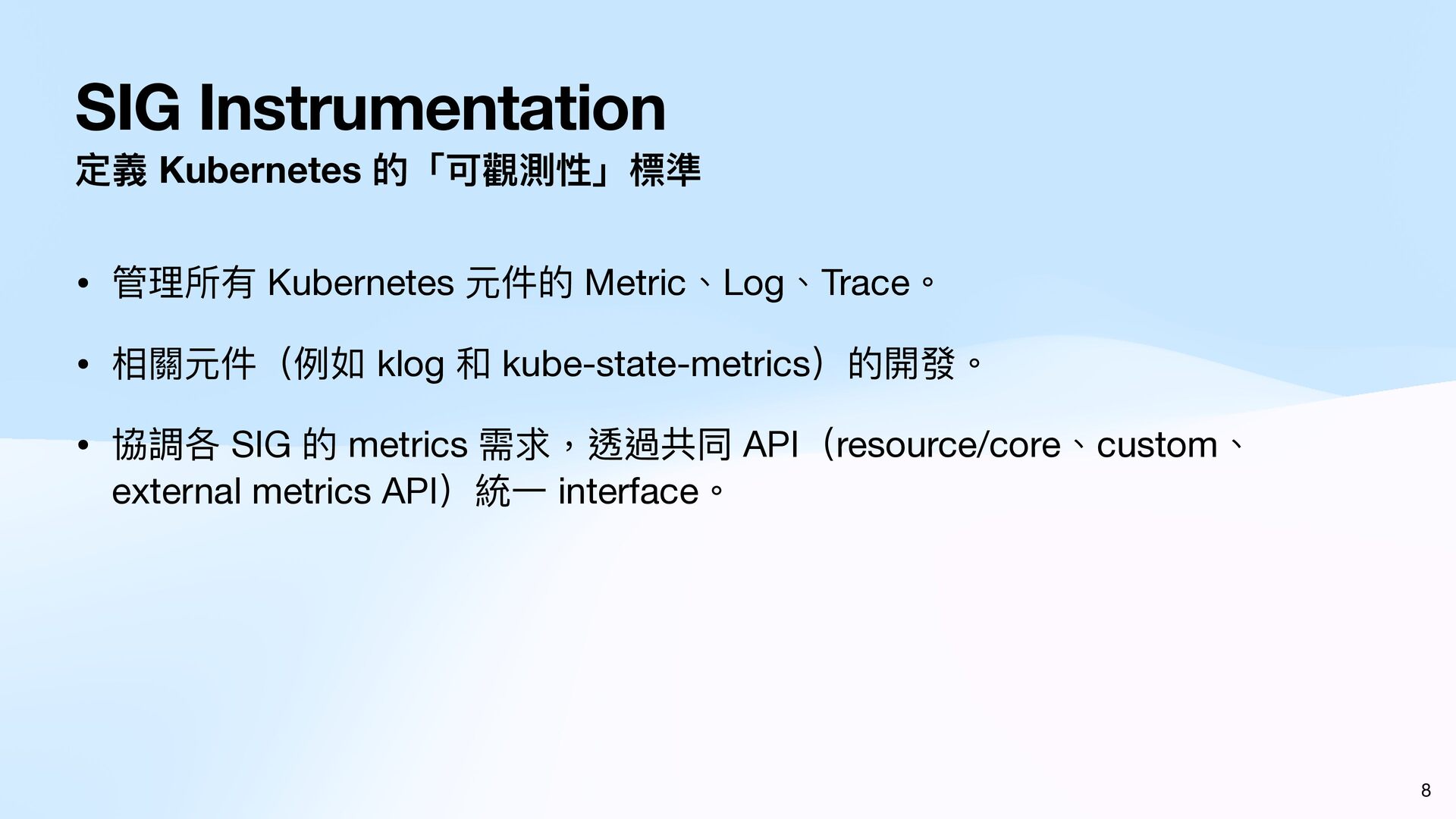 SIG Instrumentation 定義 Kubernetes 的「可觀測性」標準 • 管理所有 Kubernetes 元件的 Metric、Log、Trace。