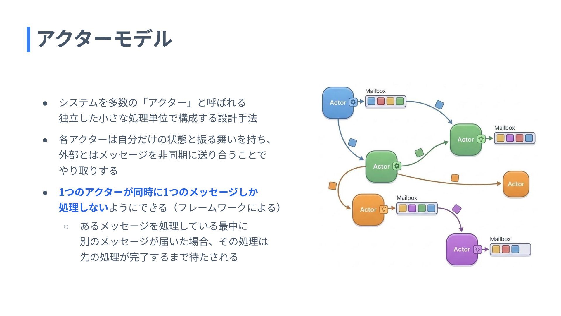 • タグ1つにつきアクター1つを配置する • タグの ID をアクターの ID として使う • あるタグに対する操作は、必ず1つの特定のアクターが担当 これによって、 ➔ 同⼀タグへの並⾏処理の同時実⾏制御が可能 ➔ 分散環境でも単⼀プロセスのような安全な処理が可能 ➔ 多様なストレージに対応しやすくなる Orleans アクターによる同時実⾏制御