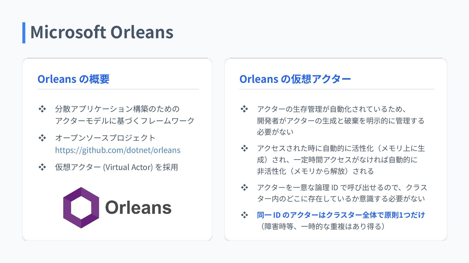 ❖ 仮想アクター (Virtual Actor) を採⽤ Orleans の仮想アクター ❖ アクターの⽣存管理が⾃動化されているため、 開発者がアクターの⽣成と破棄を明⽰的に管理する 必要がない ❖ アクセスされた時に⾃動的に活性化(メモリ上に⽣ 成)され、⼀定時間アクセスがなければ⾃動的に ⾮活性化(メモリから解放)される ❖ アクターを⼀意な論理 ID で呼び出せるので、クラス ター内のどこに存在しているか意識する必要がない ❖ 同⼀ ID のアクターはクラスター全体で原則1つだけ (障害時等、⼀時的な重複はあり得る)