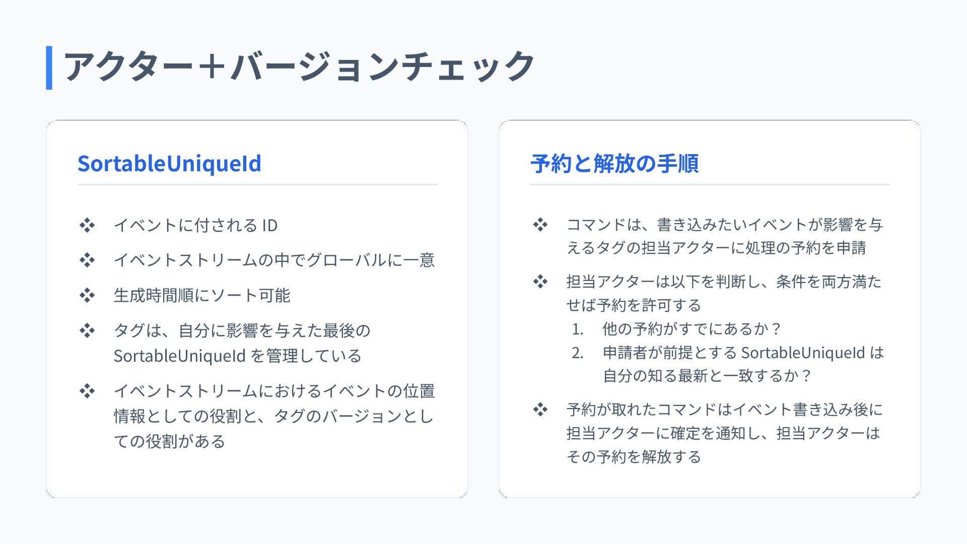 SortableUniqueId を管理している ❖ イベントストリームにおけるイベントの位置 情報としての役割と、タグのバージョンとし ての役割がある ❖ コマンドは、書き込みたいイベントが影響を与 えるタグの担当アクターに処理の予約を申請 ❖ 担当アクターは以下を判断し、条件を両⽅満た せば予約を許可する 1. 他の予約がすでにあるか? 2. 申請者が前提とする SortableUniqueId は ⾃分の知る最新と⼀致するか? ❖ 予約が取れたコマンドはイベント書き込み後に 担当アクターに確定を通知し、担当アクターは その予約を解放する SortableUniqueId 予約と解放の⼿順