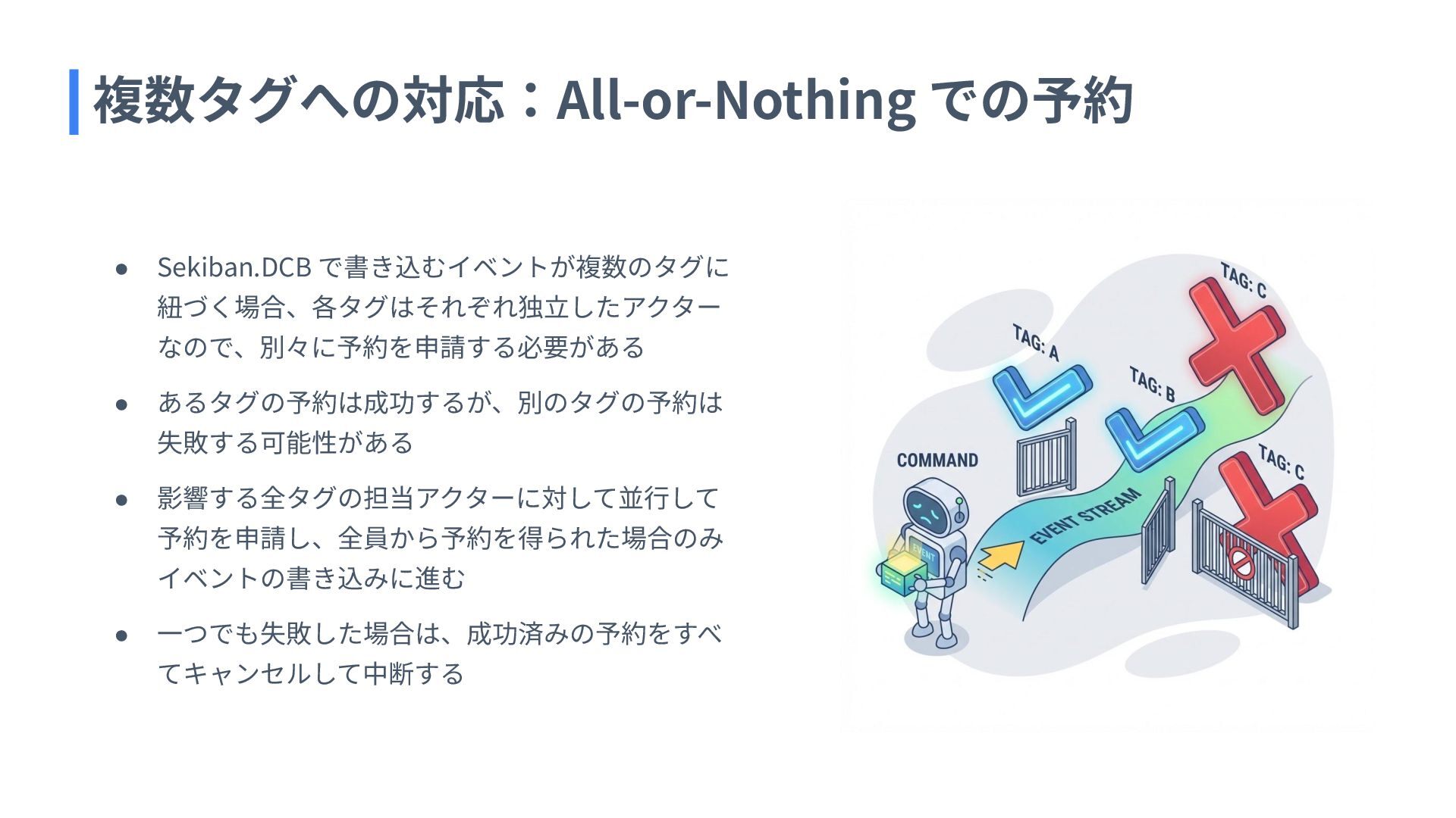 10. 複数タグへの対応:All-or-Nothing での予約 • Sekiban.DCB で書き込むイベントが複数のタグに 紐づく場合、各タグはそれぞれ独⽴したアクター なので、別々に予約を申請する必要がある • あるタグの予約は成功するが、別のタグの予約は 失敗する可能性がある