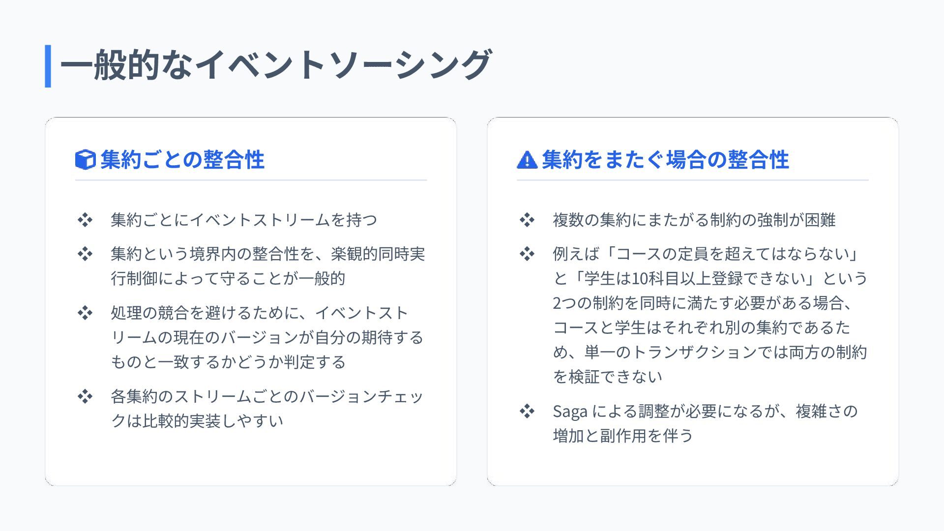 ❖ 各集約のストリームごとのバージョンチェッ クは⽐較的実装しやすい 集約をまたぐ場合の整合性 ❖ 複数の集約にまたがる制約の強制が困難 ❖ 例えば「コースの定員を超えてはならない」 と「学⽣は10科⽬以上登録できない」という 2つの制約を同時に満たす必要がある場合、 コースと学⽣はそれぞれ別の集約であるた め、単⼀のトランザクションでは両⽅の制約 を検証できない ❖ Saga による調整が必要になるが、複雑さの 増加と副作⽤を伴う ⼀般的なイベントソーシング