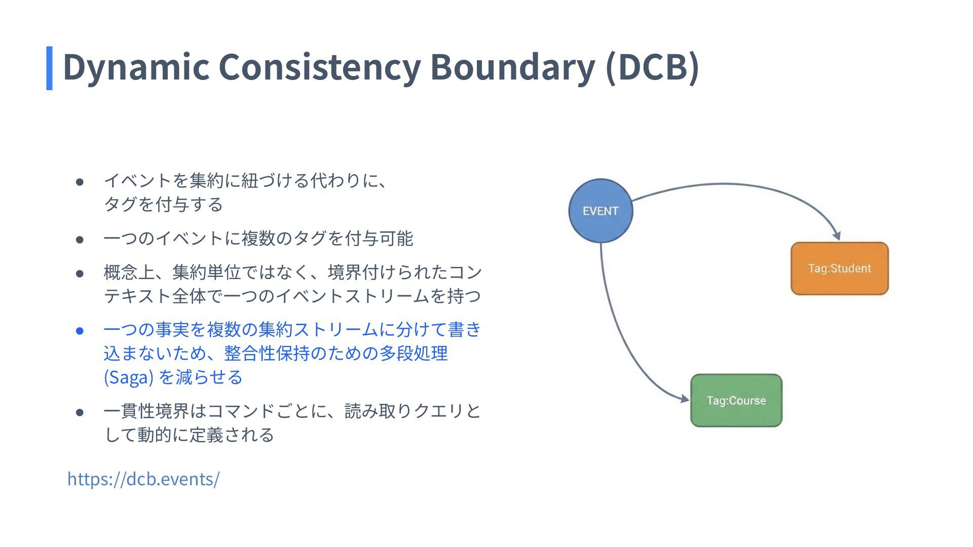 込まないため、整合性保持のための多段処理 (Saga) を減らせる • ⼀貫性境界はコマンドごとに、読み取りクエリと して動的に定義される https://dcb.events/ Dynamic Consistency Boundary (DCB)