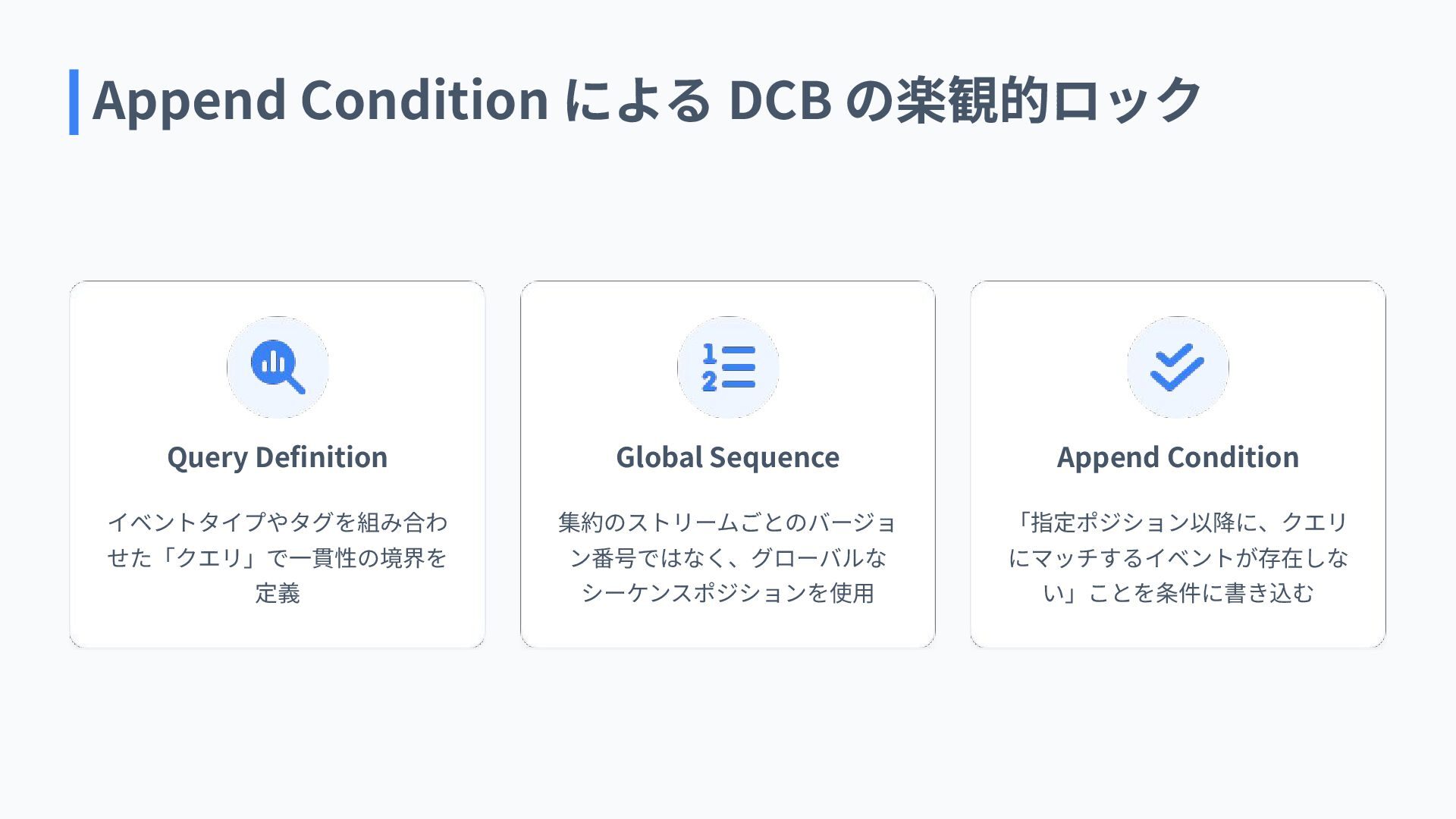 Append Condition 「指定ポジション以降に、クエリ にマッチするイベントが存在しな い」ことを条件に書き込む Append Condition による DCB の楽観的ロック