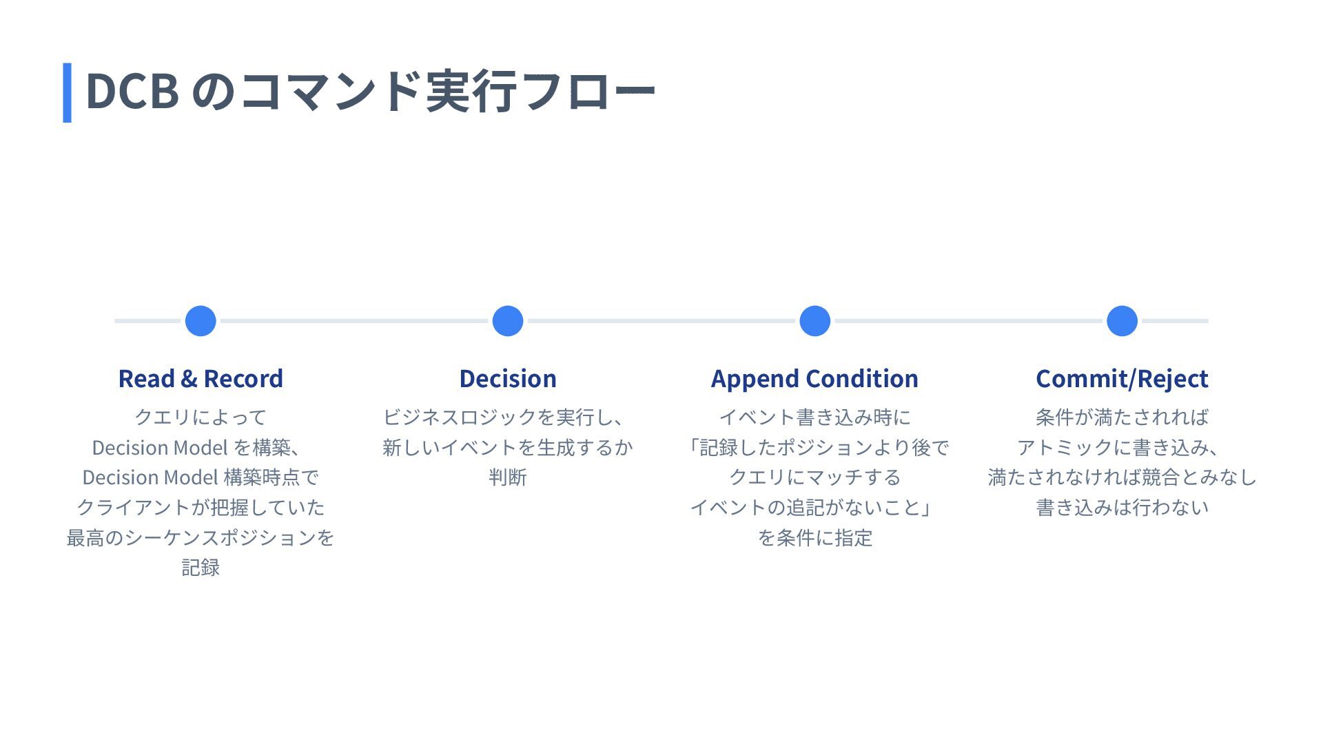 クライアントが把握していた 最⾼のシーケンスポジションを 記録 Decision ビジネスロジックを実⾏し、 新しいイベントを⽣成するか 判断 Append Condition イベント書き込み時に 「記録したポジションより後で クエリにマッチする イベントの追記がないこと」 を条件に指定 Commit/Reject 条件が満たされれば アトミックに書き込み、 満たされなければ競合とみなし 書き込みは⾏わない DCB のコマンド実⾏フロー