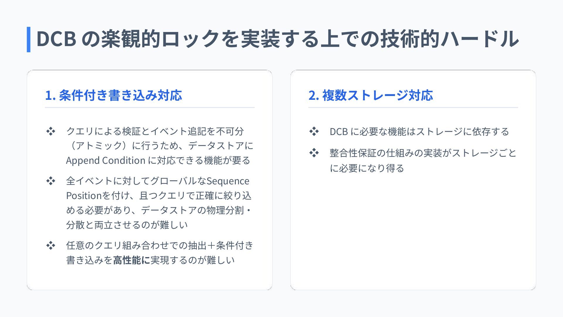 Positionを付け、且つクエリで正確に絞り込 める必要があり、データストアの物理分割‧ 分散と両⽴させるのが難しい ❖ 任意のクエリ組み合わせでの抽出+条件付き 書き込みを⾼性能に実現するのが難しい 2. 複数ストレージ対応 ❖ DCB に必要な機能はストレージに依存する ❖ 整合性保証の仕組みの実装がストレージごと に必要になり得る DCB の楽観的ロックを実装する上での技術的ハードル