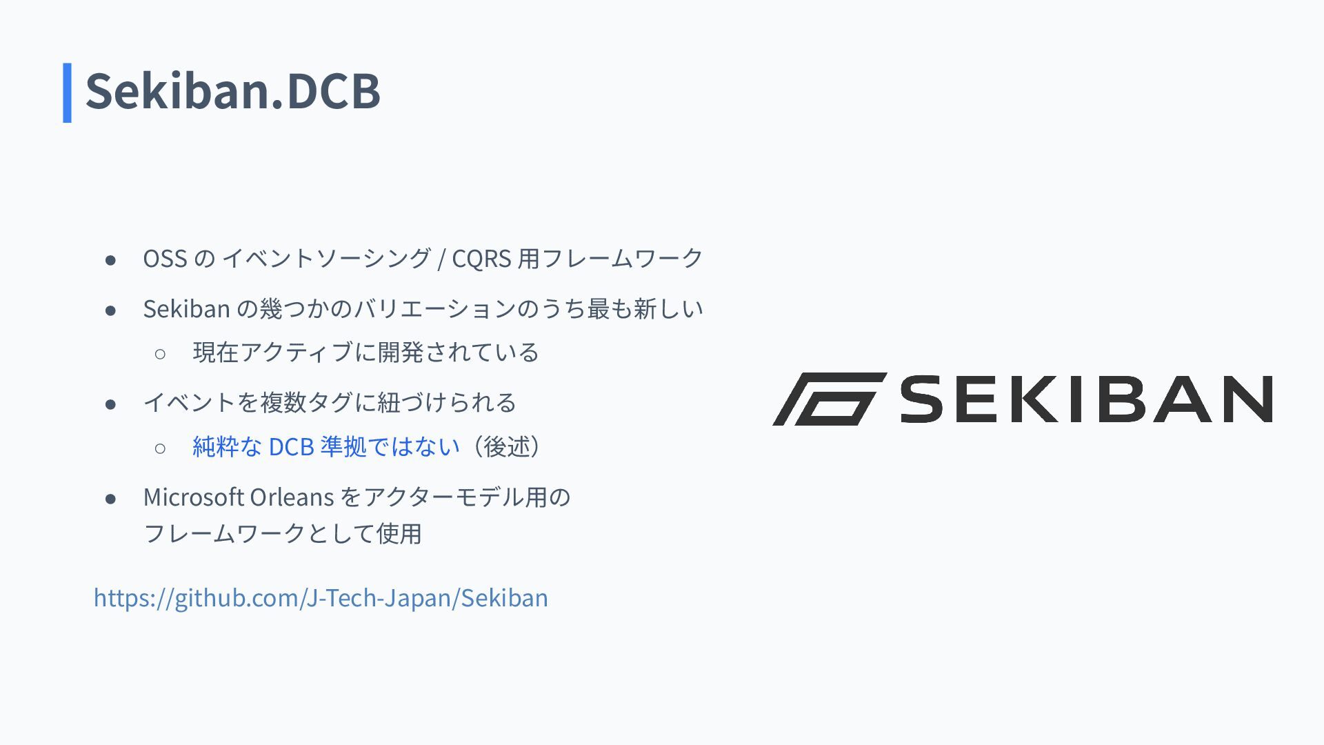 ◦ 現在アクティブに開発されている • イベントを複数タグに紐づけられる ◦ 純粋な DCB 準拠ではない(後述) • Microsoft Orleans をアクターモデル⽤の フレームワークとして使⽤ https://github.com/J-Tech-Japan/Sekiban Sekiban.DCB