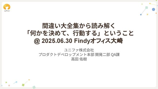 間違い⼤全集から読み解く 「何かを決めて、⾏動する」ということ @ 2025.06.30 Findyオフィス大崎 ユニファ株式会社 プロダクトデベロップメント本部 開発⼆部 QA課 ⾼⽥