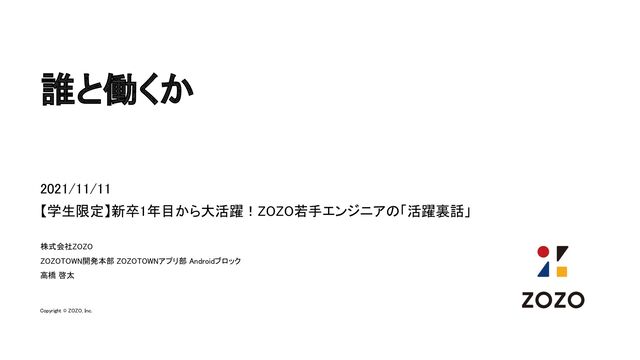 誰と働くか 2021/11/11 【学生限定】新卒1年目から大活躍!ZOZO若手エンジニアの「活躍裏話」 株式会社ZOZO ZOZOTOWN開発本部 ZOZOTOWNアプリ部 Androidブロック 高橋 啓太 Copyright