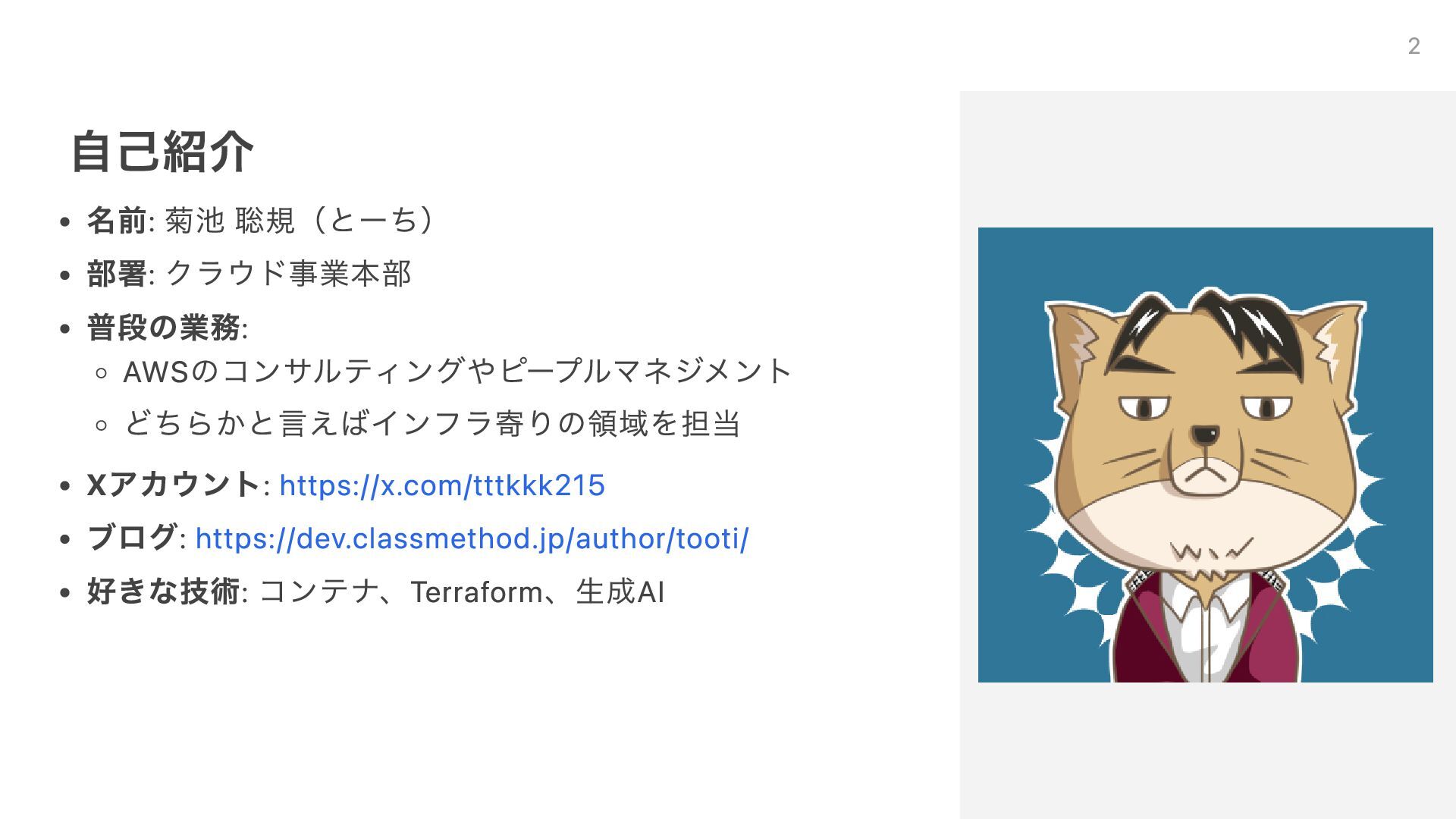 自己紹介 名前: 菊池 聡規(とーち) 部署: クラウド事業本部 普段の業務: AWSのコンサルティングやピープルマネジメント どちらかと言えばインフラ寄りの領域を担当 Xアカウント: