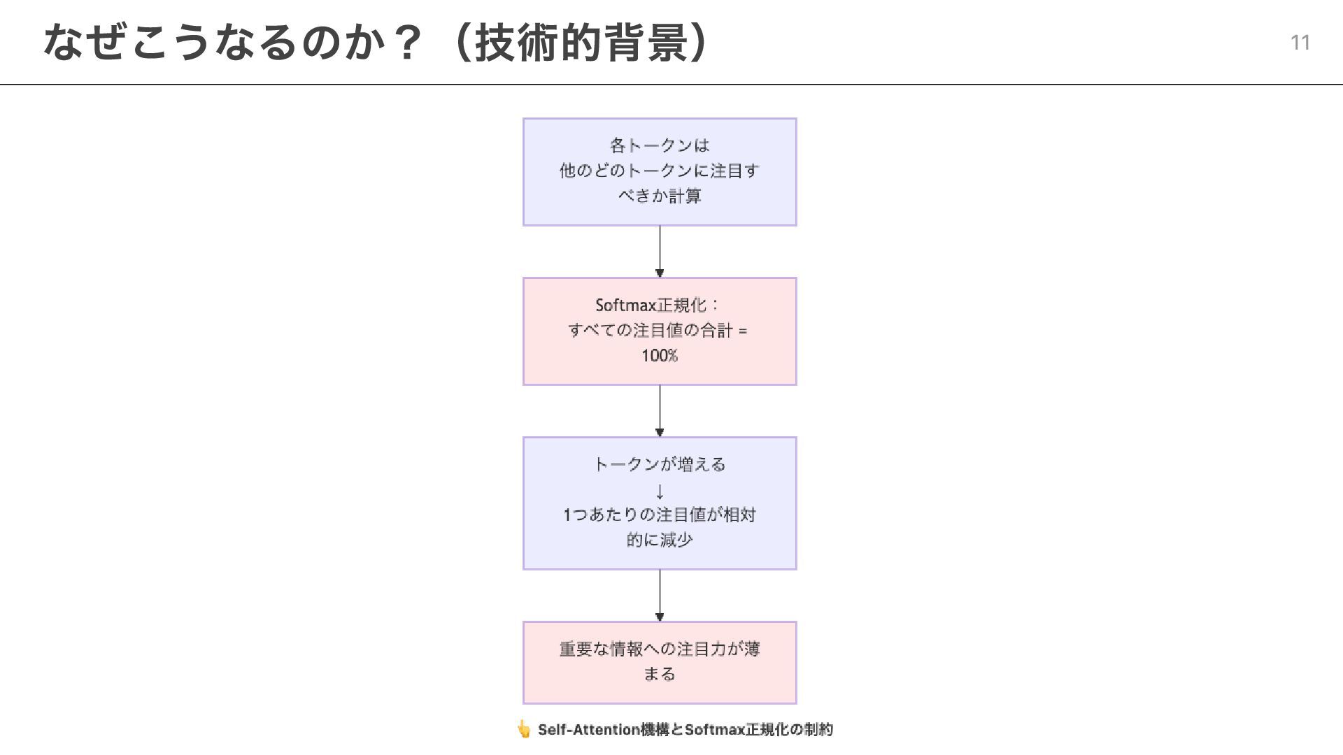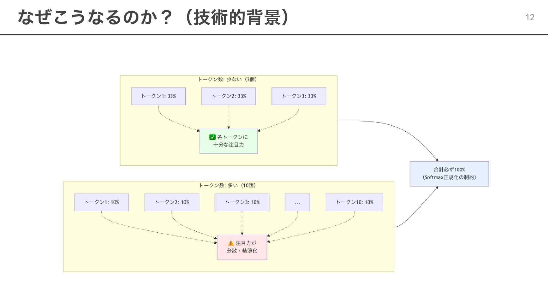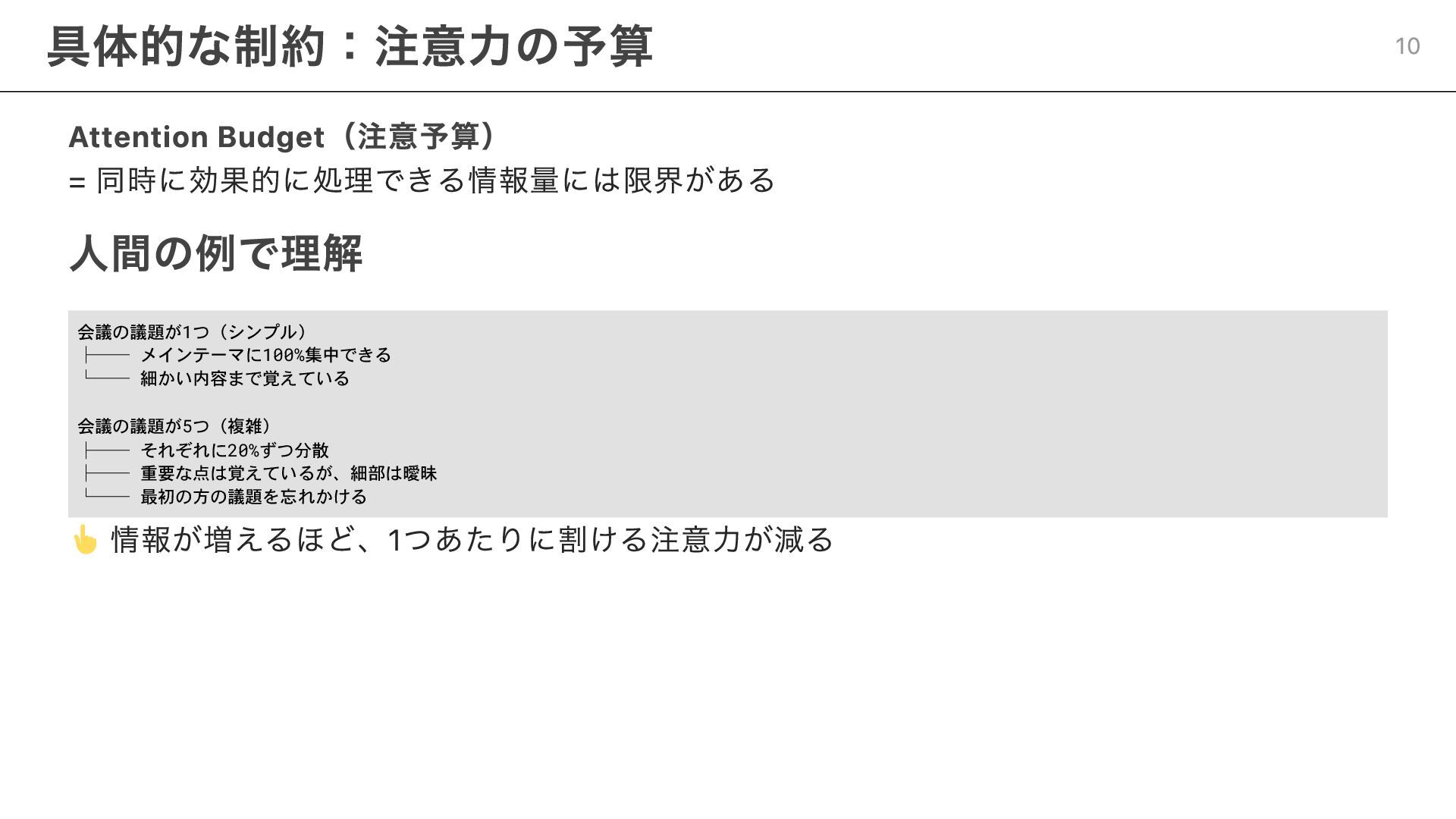 会議の議題が5つ(複雑) ├── それぞれに20%ずつ分散 ├── 重要な点は覚えているが、細部は曖昧 └── 最初の方の議題を忘れかける 情報が増えるほど、1つあたりに割ける注意力が減る 具体的な制約:注意力の予算 10